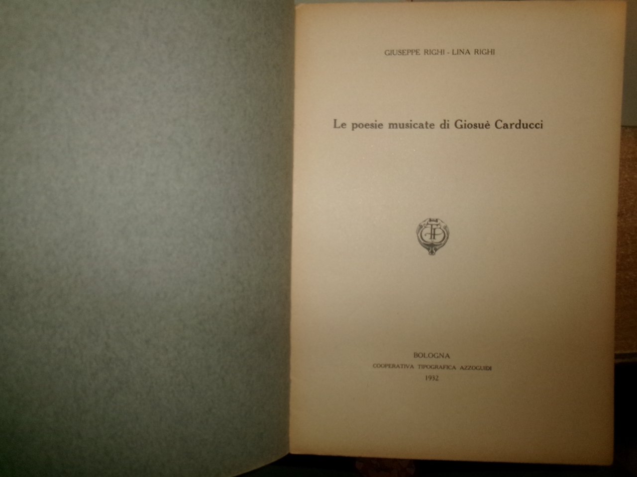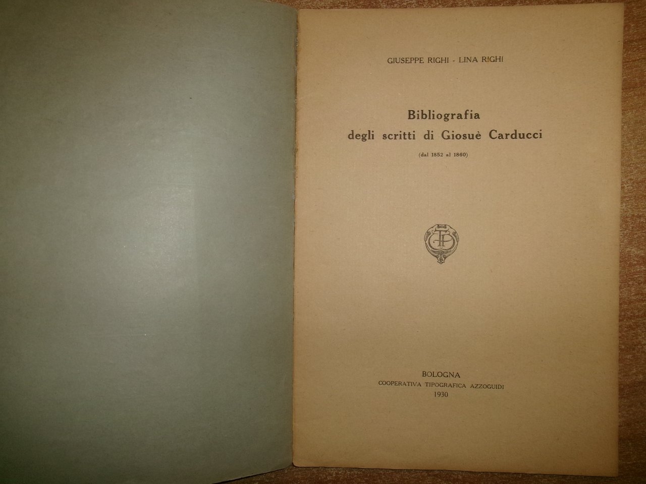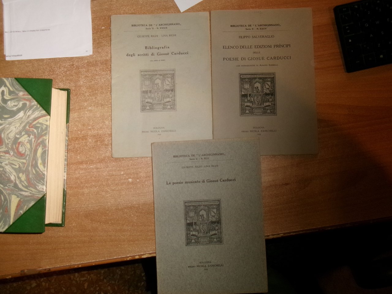 3 opuscoli. Filippo Salveraglio. Giuseppe Righi - Lina Righi. 3 opuscoli in-8°, br. orig. Bibliografia degli scritti di Giosuè Carducci. 35 pp.; Le Poesie musicate di Giosuè Carducci. 56 pp.; Elenco delle edizioni prìncipi delle Poesie di Giosue Carducci con introduzione di Albano Sorbelli. 45 pp. Ben conservati. Neg. mob. 4 entro busta trasp.