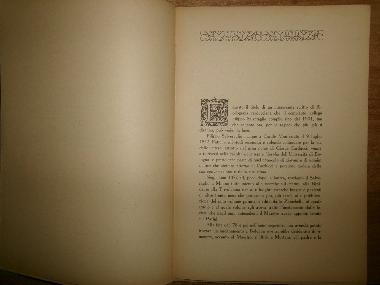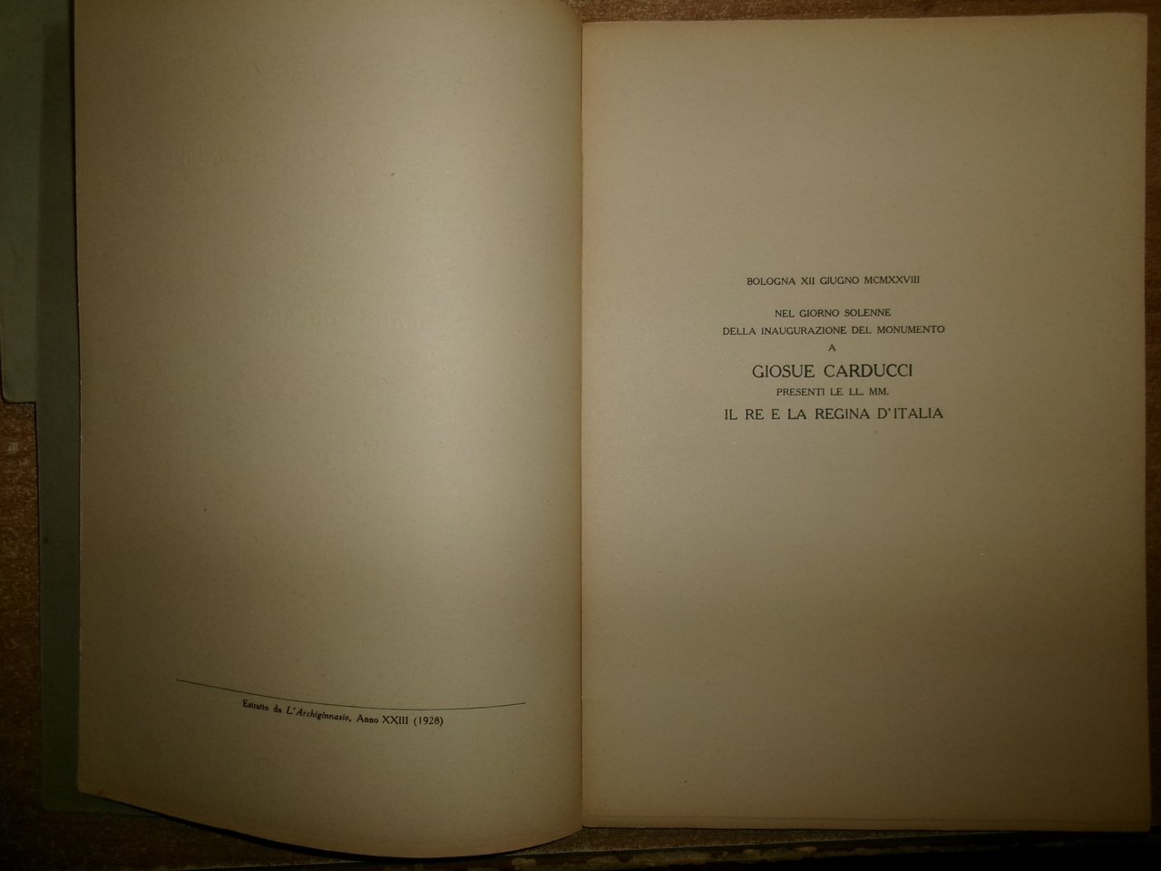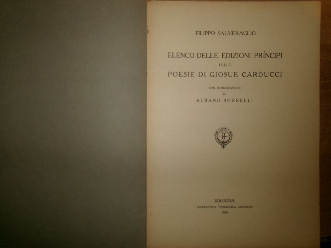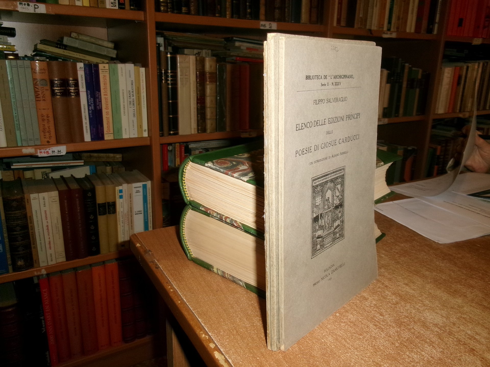 3 opuscoli. Filippo Salveraglio. Giuseppe Righi - Lina Righi. 3 opuscoli in-8°, br. orig. Bibliografia degli scritti di Giosuè Carducci. 35 pp.; Le Poesie musicate di Giosuè Carducci. 56 pp.; Elenco delle edizioni prìncipi delle Poesie di Giosue Carducci con introduzione di Albano Sorbelli. 45 pp. Ben conservati. Neg. mob. 4 entro busta trasp.