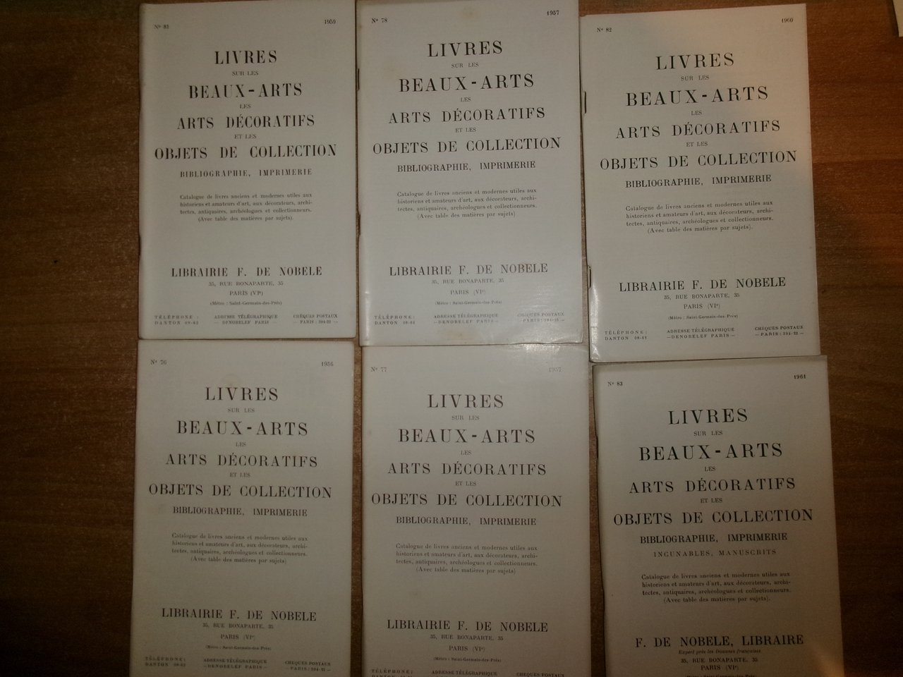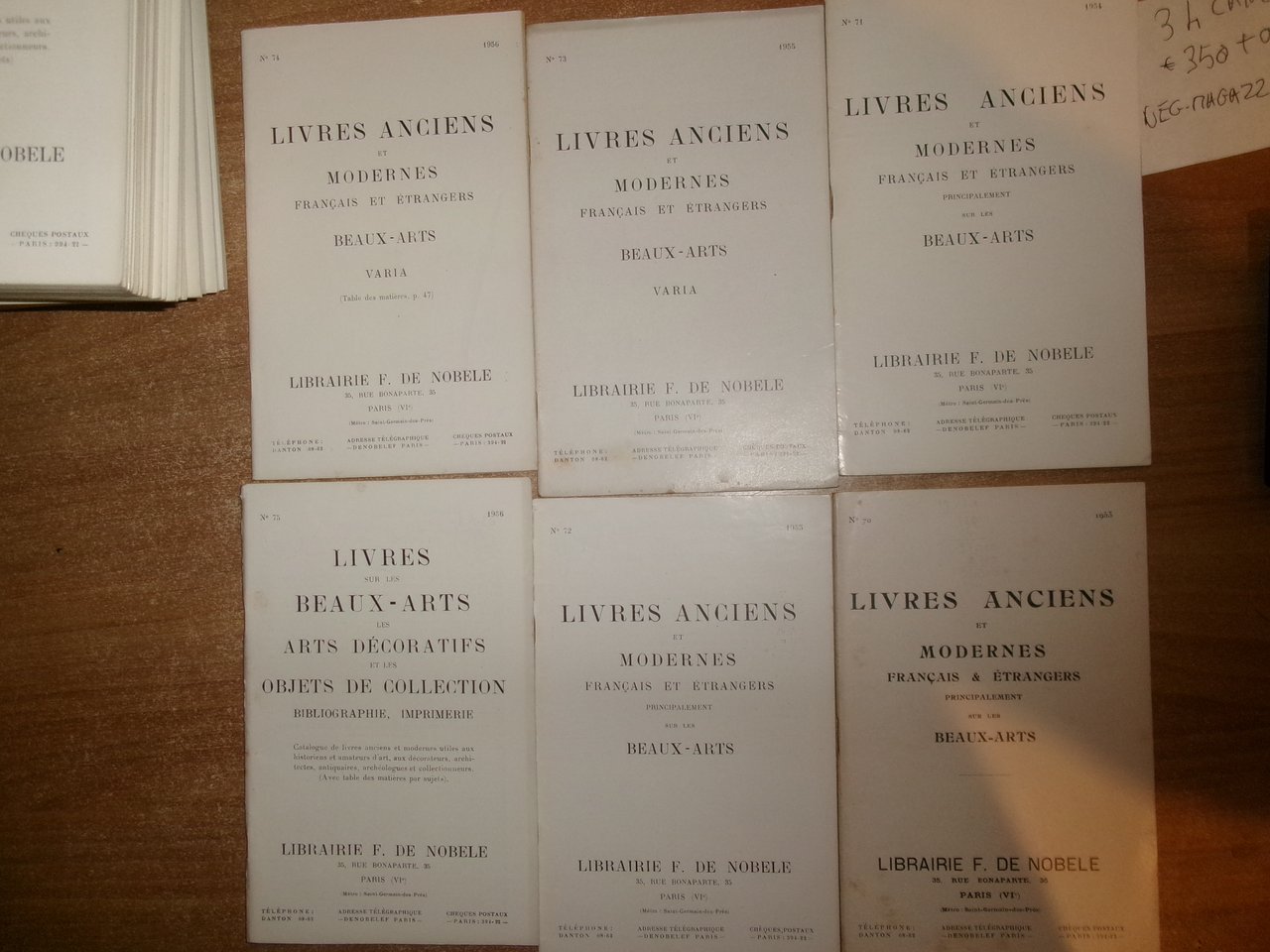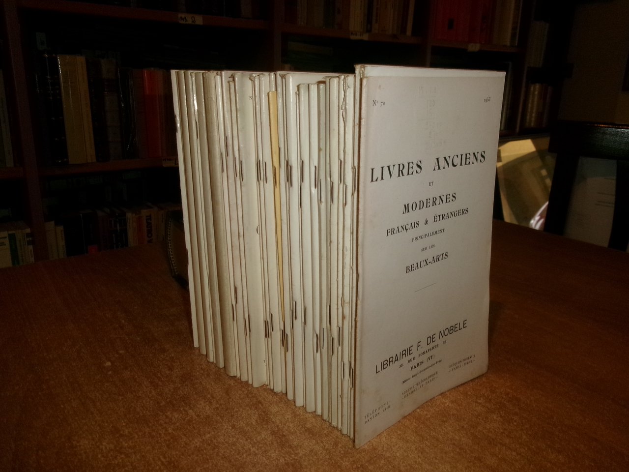 Librairie F. DE NOBELE. Paris, Rue Bonaparte, 1953/1984. 34 cataloghi. LIVRES sur les BEAUX-ARTS les ARTS Décoratifs et les Objets de Collection Bibliographie, Imprimerie. In-16° grande, br. la maggior parte con punti metallici. Sono presenti i seguenti numeri: 70 - 71 - 72 - 73 - 74 - 75 - 76 - 77 - 78 - 81 - 82 - 83 - 84 - 85 - 86 - 87 - 88 - 89 - 90 - 92 - 94 - 96 - 97 - 98 - 99 - 100 - 101 - 102 - 103 - 104 - 105 - 106 - 107 - 108. Accurata descrizione con alcune illustrazioni di innumerevoli libri rari riguardanti l' arte. Ben conservati con testo in francese e prezzi in franchi. Vendibili solo in Italia. Neg. magazz. mob. grigio entro busta azzurra.