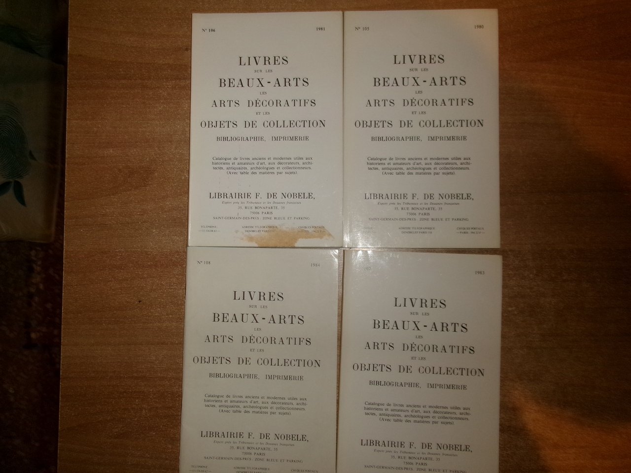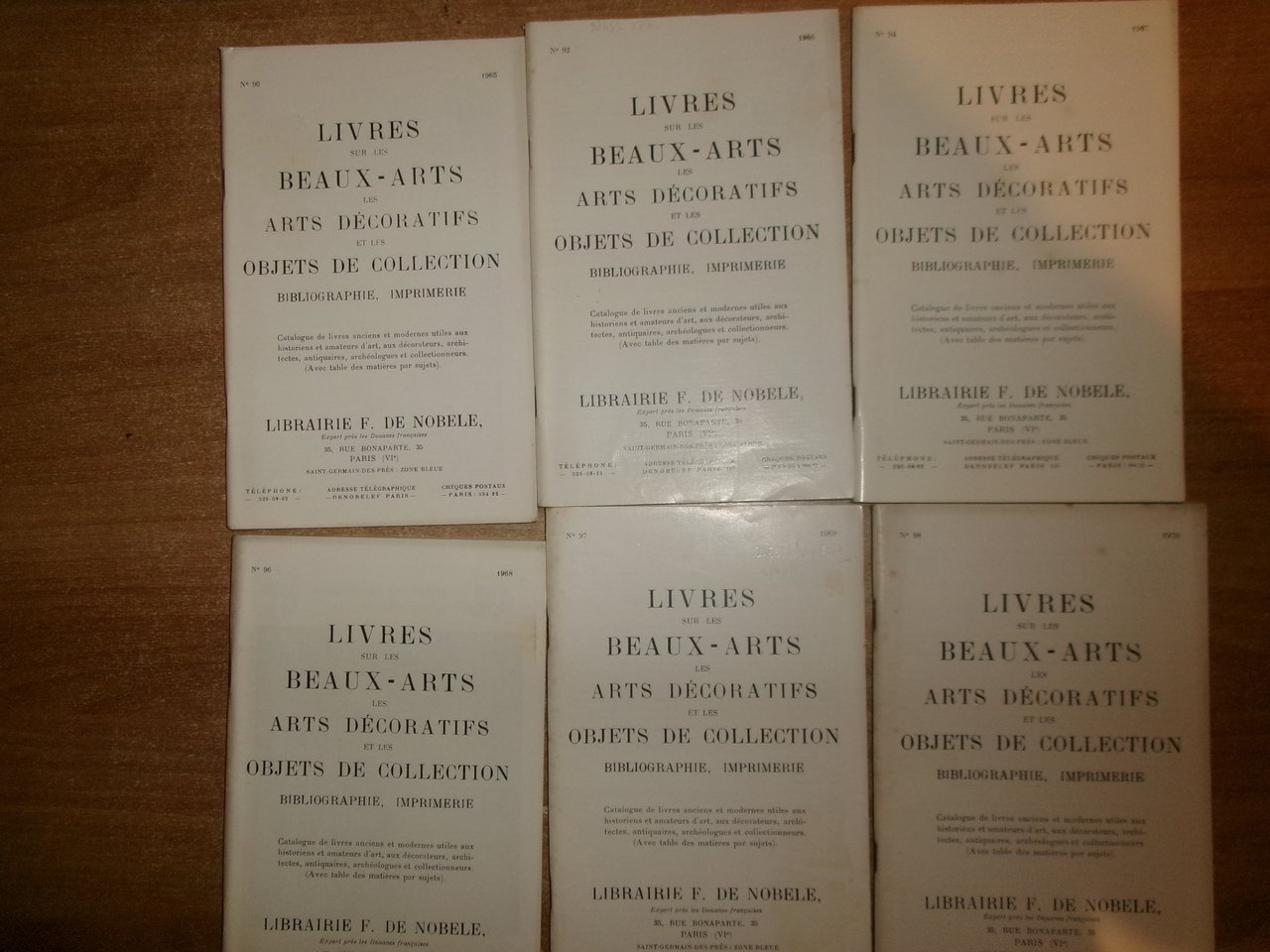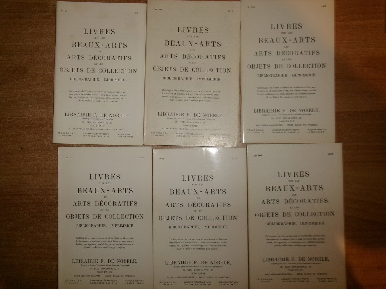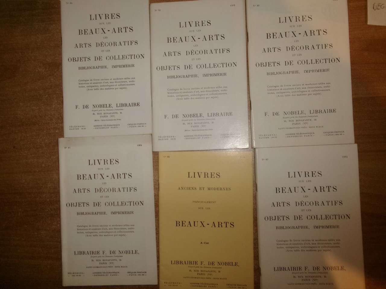 Librairie F. DE NOBELE. Paris, Rue Bonaparte, 1953/1984. 34 cataloghi. LIVRES sur les BEAUX-ARTS les ARTS Décoratifs et les Objets de Collection Bibliographie, Imprimerie. In-16° grande, br. la maggior parte con punti metallici. Sono presenti i seguenti numeri: 70 - 71 - 72 - 73 - 74 - 75 - 76 - 77 - 78 - 81 - 82 - 83 - 84 - 85 - 86 - 87 - 88 - 89 - 90 - 92 - 94 - 96 - 97 - 98 - 99 - 100 - 101 - 102 - 103 - 104 - 105 - 106 - 107 - 108. Accurata descrizione con alcune illustrazioni di innumerevoli libri rari riguardanti l' arte. Ben conservati con testo in francese e prezzi in franchi. Vendibili solo in Italia. Neg. magazz. mob. grigio entro busta azzurra.