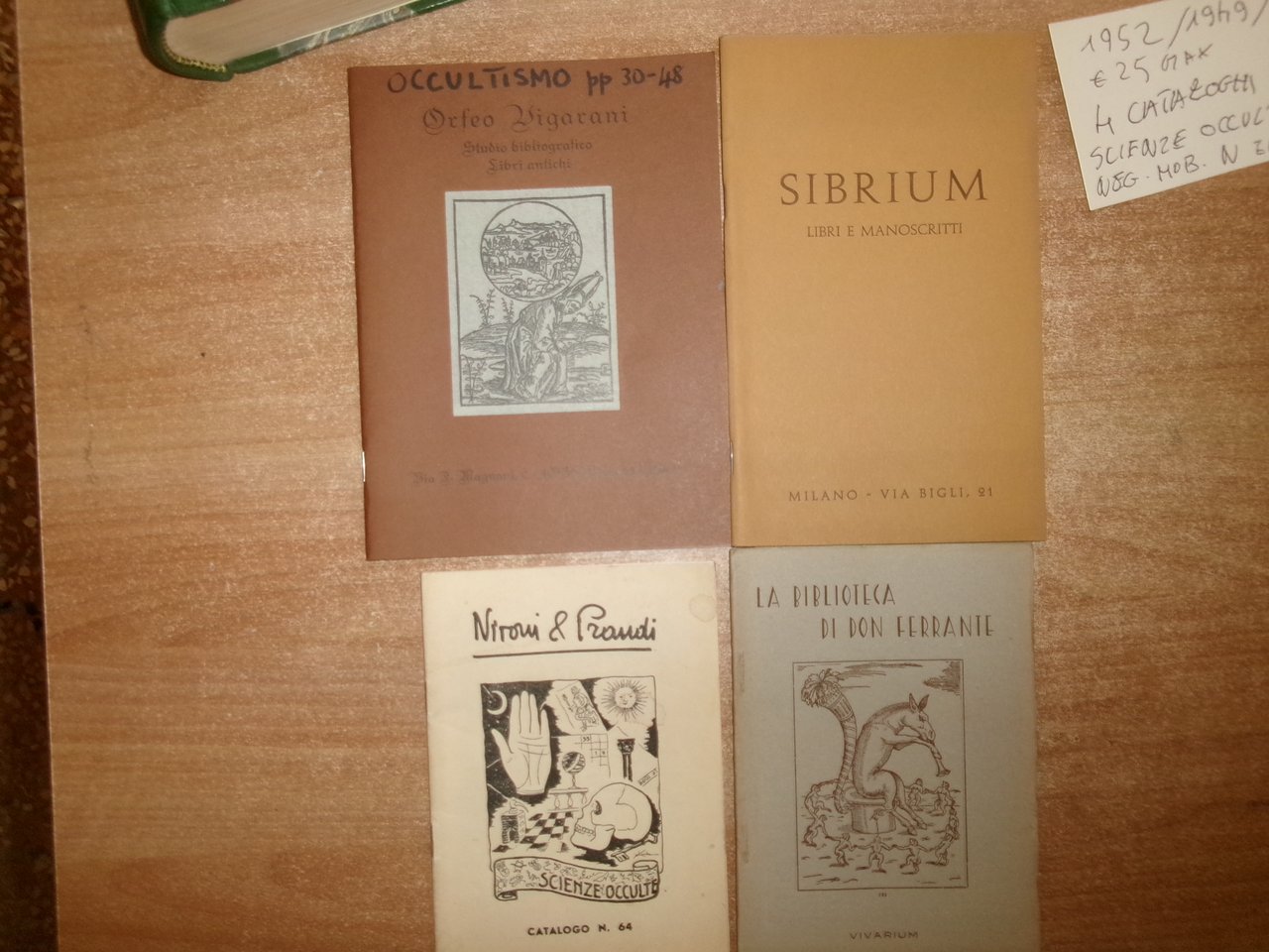 4 cataloghi di Scienze Occulte in-8° e in-16°, br. SIBRIUM 65 pp. con alcune illustrazioni e accurata descrizione di 381 libri di materia occulta, in foglio separato ci sono i prezzi. /La Biblioteca di Don Ferrante 48 pp. con accurata descrizione di 194 libri, in foglio separato sono presenti i prezzi. /Nironi & Prandi 39 pp. con accurata descrizione di 240 libri rari con prezzi. /Orfeo Vigarani 48 pp. con accurata descrizione di 351 libri rari con numerose illustrazioni/riproduzioni con prezzi. Ottimo stato. Neg. mob. N entro busta trasp.