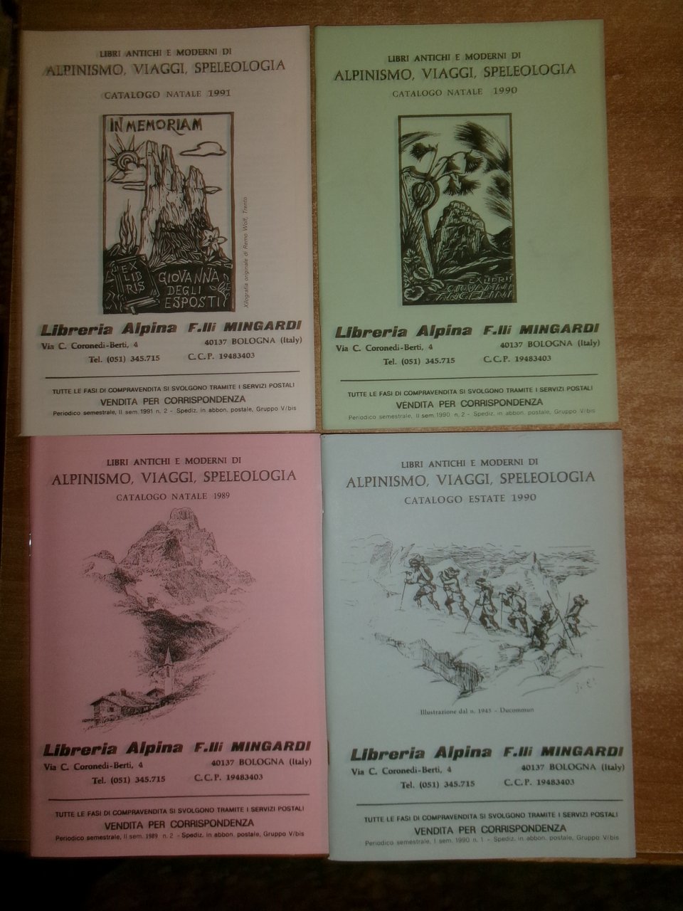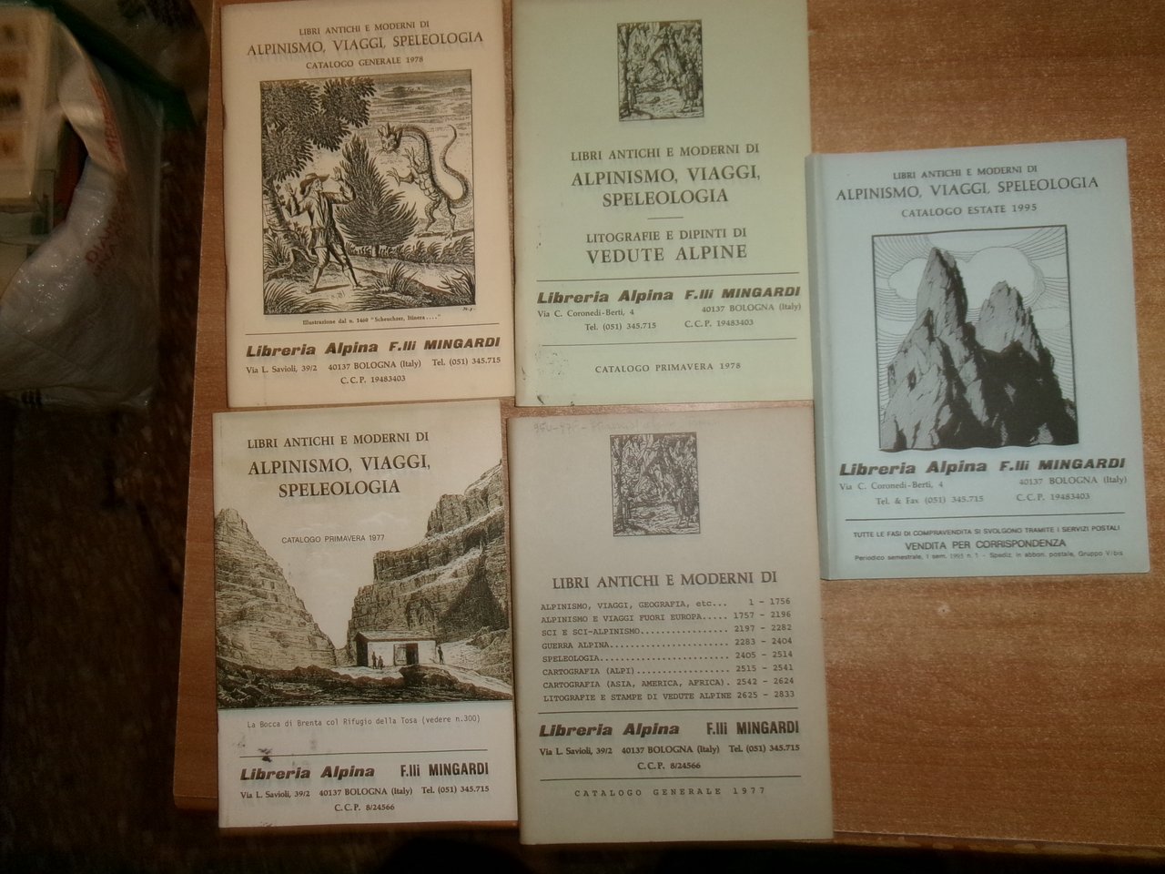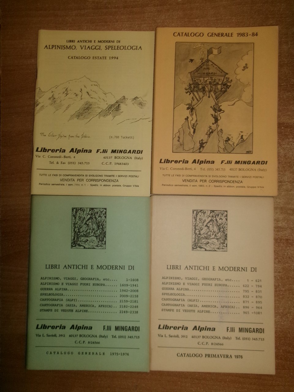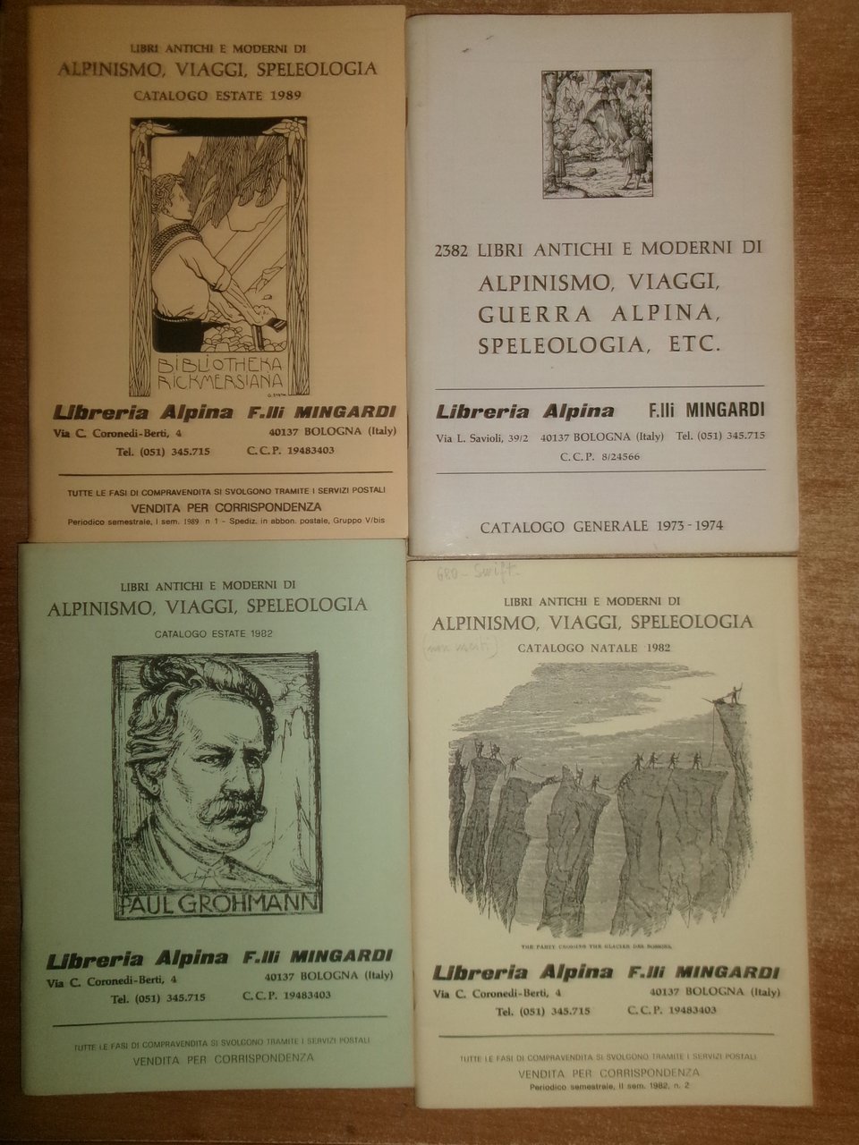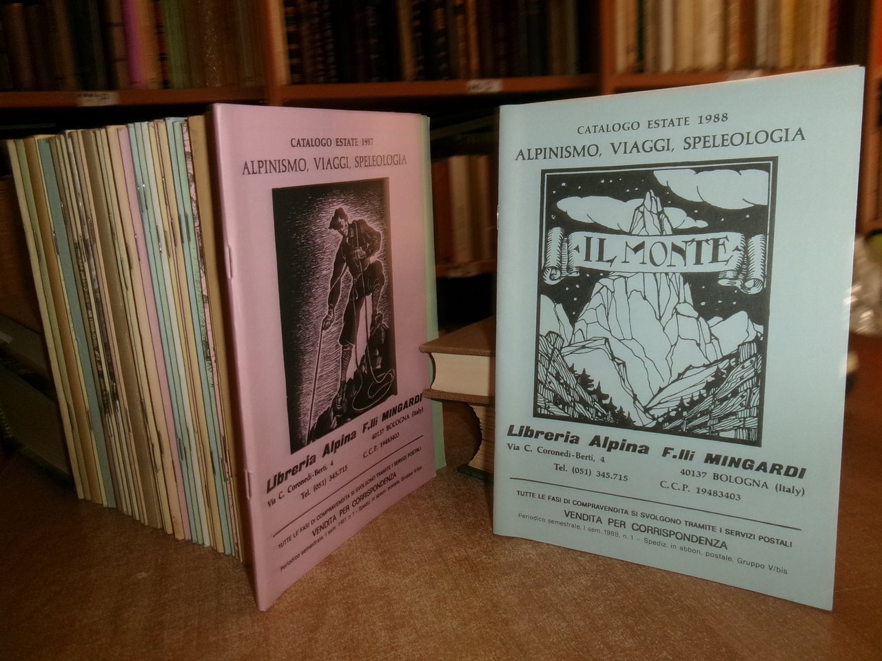 Bologna, Libreria Alpina F.lli Mingardi, 1973... Libri antichi e Moderni di Alpinismo, Viaggi, Speleologia. 40 cataloghi in-8°, br. orig. la maggior parte con punti metallici. Accurata descrizione di migliaia di libri con prezzi. In ottimo stato di conservazione. Neg. in alto esot. 10 in scatola