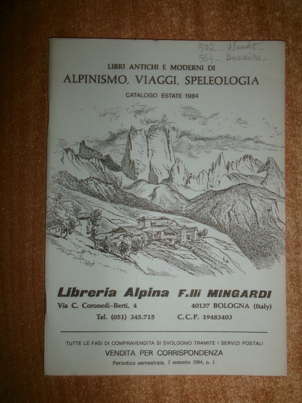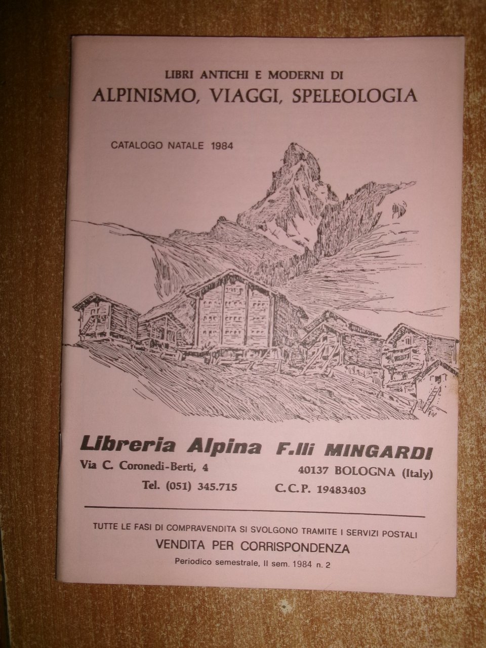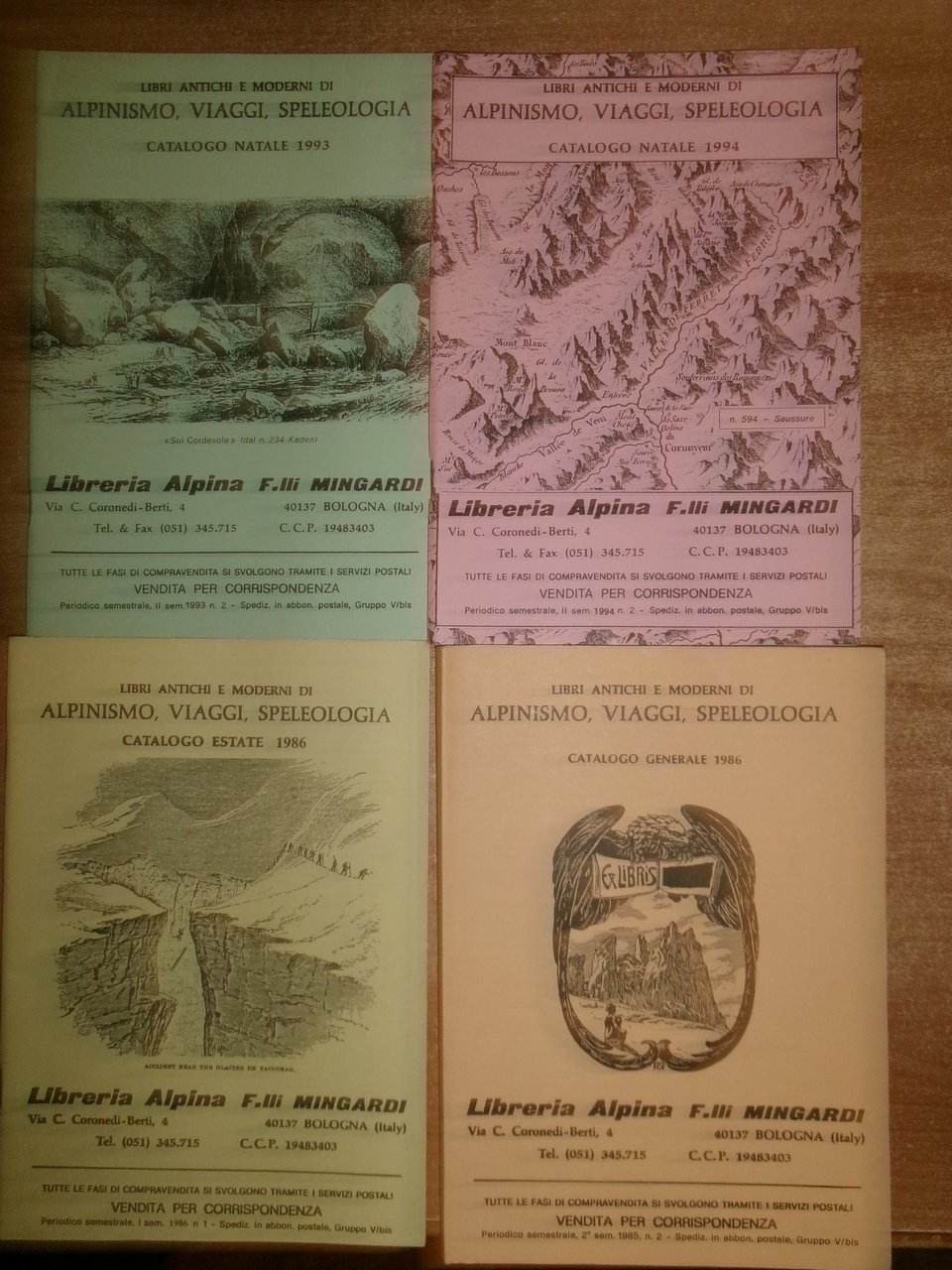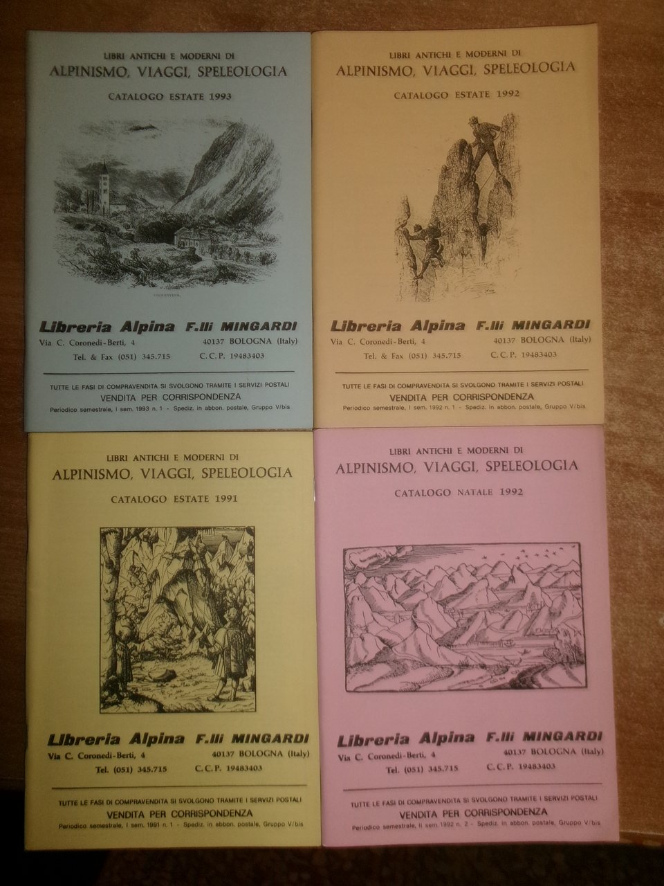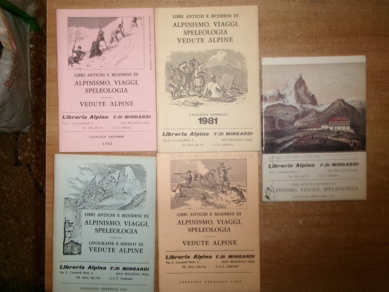 Bologna, Libreria Alpina F.lli Mingardi, 1973... Libri antichi e Moderni di Alpinismo, Viaggi, Speleologia. 40 cataloghi in-8°, br. orig. la maggior parte con punti metallici. Accurata descrizione di migliaia di libri con prezzi. In ottimo stato di conservazione. Neg. in alto esot. 10 in scatola