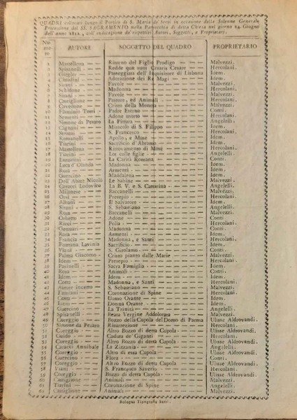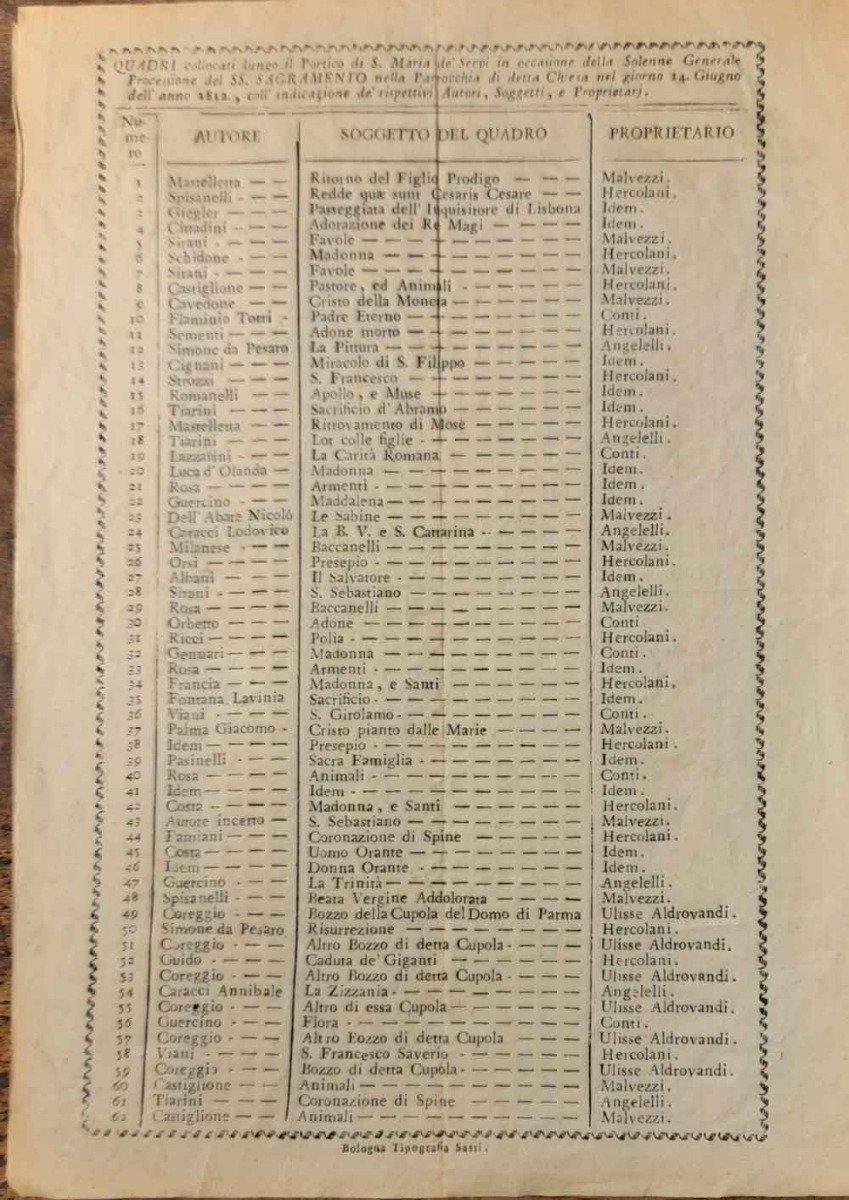 <p>29x21 cm pagina incorniciata, tre righe in testa e tre colonne con elenco di 62 opere d'arte, il soggetto del quadro e il proprietario prestatore in occasione della processione del SS. Sagramento. Tra gli autori delle opere: Sirani, Guercino, Albani, Ricci, Caracci, Coreggio e molti altri. Assai raro</p>