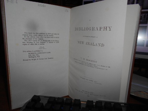 T.M. HOCKEN. Wellington, stampato da John Mackay, Government Printer, 1909. A Bibliography of the relating to NEW ZEALAND. In-8°, tela edit. con titolo in oro al dorso. xii, 619 pp. Ottimo esemplare in tiratura limitata in 1250 copie (copia n° 1103). Vendibile solo in Italia. Uff. B - III - 6
