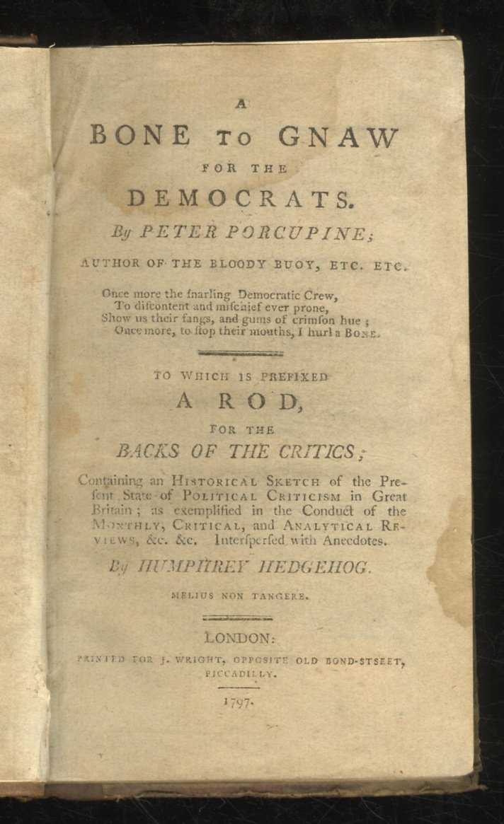 A Bone to Gnaw for the Democrats. By Peter Porcupine; to which is Prefixed a Rod for the Backs of the Critics; Containing an Historical Sketch of the Present State of Political Criticism in Great Britain; as Exemplified in the Conduct of the Monthly, Critical, and Analytical Reviews, &c. &c. Interspersed with Anecdotes. By Humphrey Hedgehog.