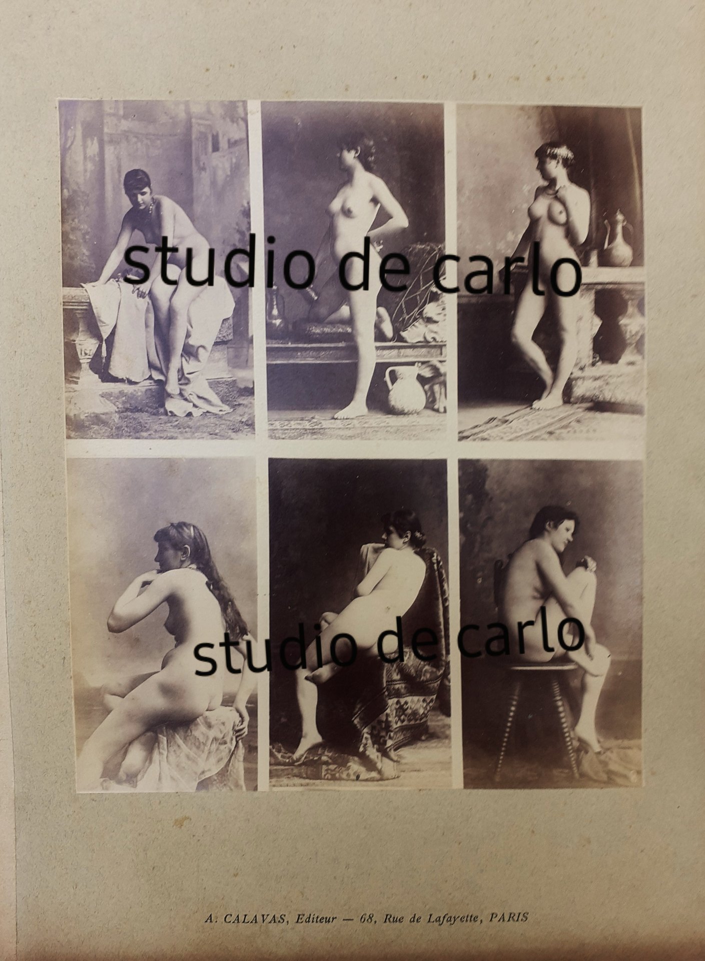 Studi di nudo femminile ad uso dei pittoriSei immagini all'albumina originali vintage su unico foglio fotografico abbinate a cartoncino.A. Calavan, Editour - 68 Rue de Lafayette, Paris msure di ogni immagne circa mm. 105x60 data ipotizzata 1877/80misure del cartoncino in mm. 305x230in buono stato