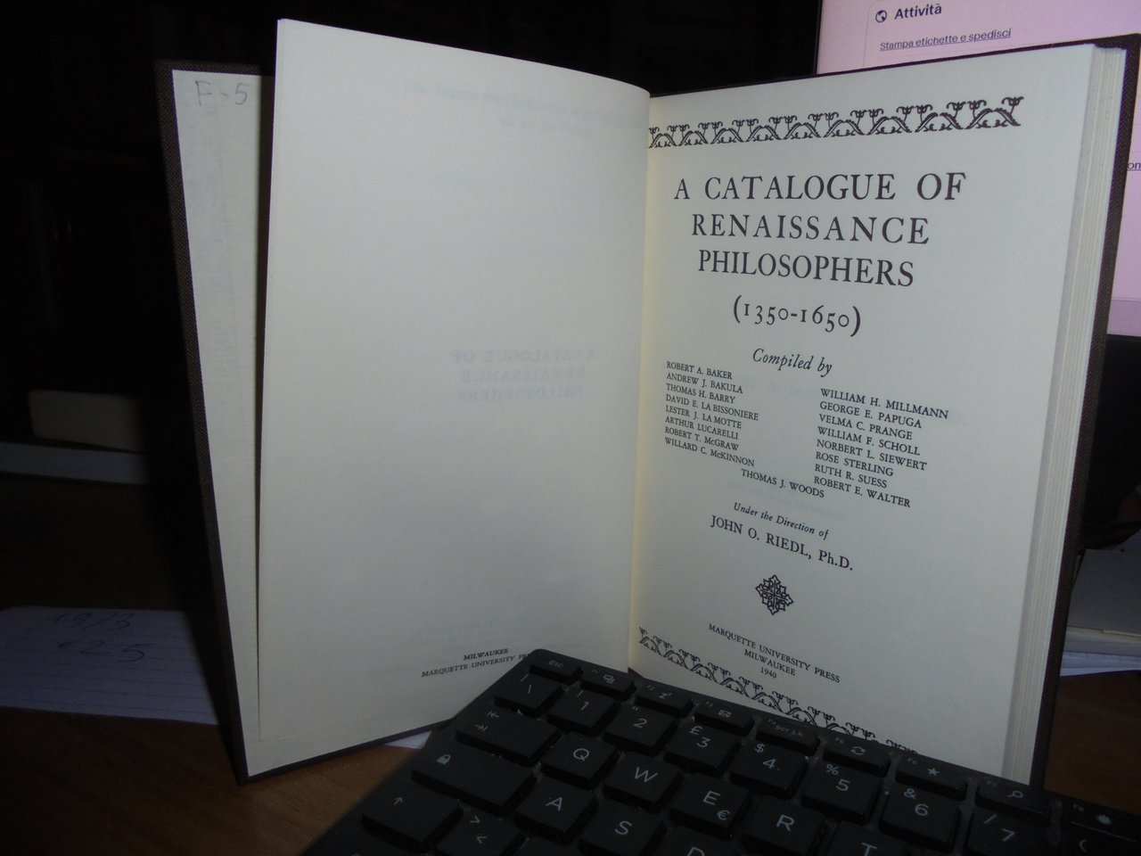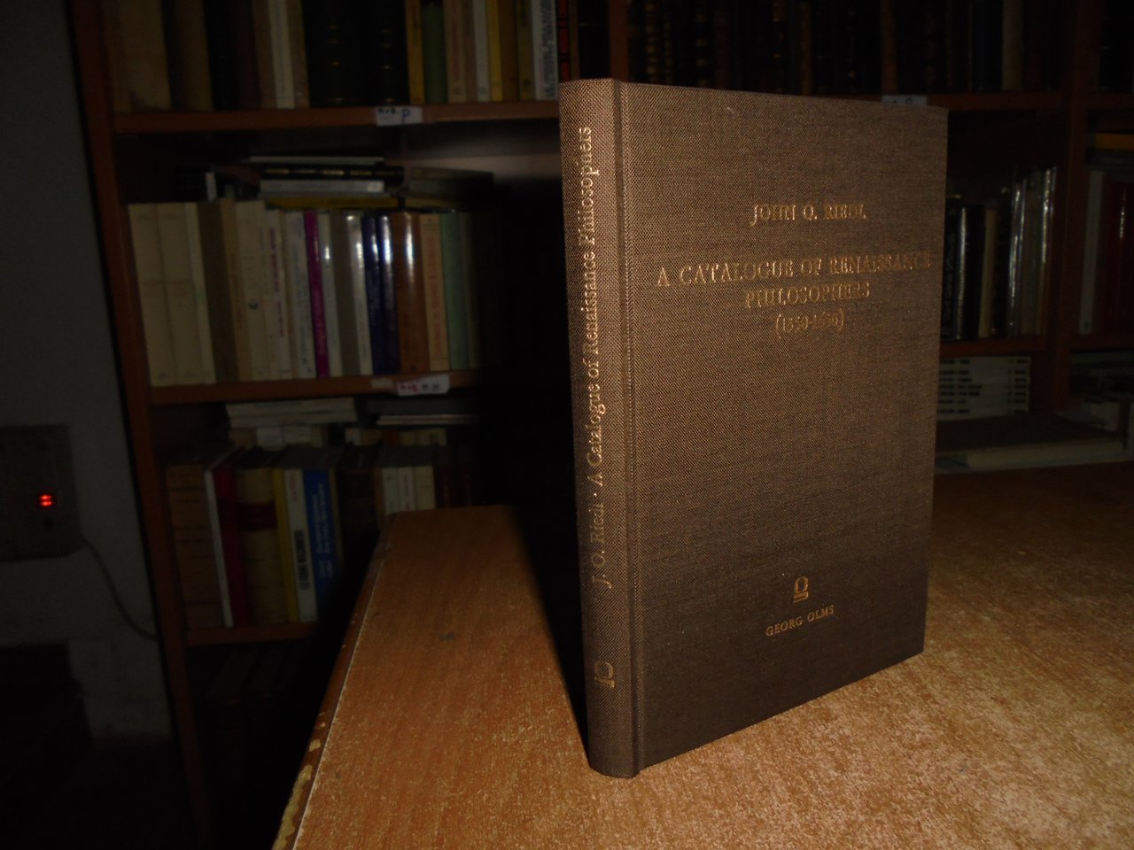 JOHN O. RIEDL. Hildesheim-New York, Georg Olms Verlag, 1973. A CATALOGUE OF RENAISSANCE PHILOSOPHERS (1350-1650). Ristampa dell' edizione datata 1940. In-16°, tela con titolo in oro al dorso e sul piano. xi, 179 pp. Come nuovo con testo in inglese. Uff. mob. F - 5