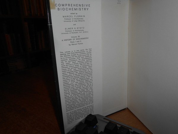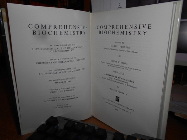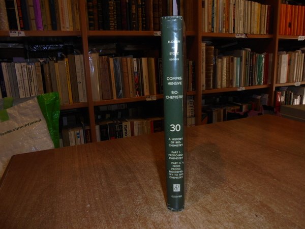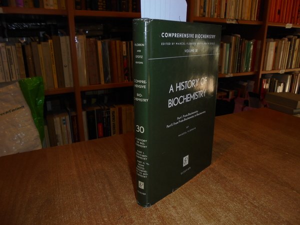 MARCEL FLORKIN and Elmer H. Stotz. Amsterdam - London - New York, Elsevier, 1972. A HISTORY OF BIOCHEMISTRY. Part. I. Proto-Biochemistry. Part. II. From Proto-Biochemistry to Biochemistry. Volume 30. In-8° piccolo, tela edit. con titolo in oro al dorso, sovracopertina. xviii, 343, (2) pp. con numerosi ritratti n.t. Sovracopertina con lievi segni d' uso ma libro come nuovo. Uff. C - IV - 6