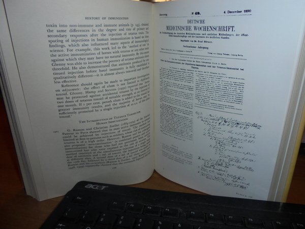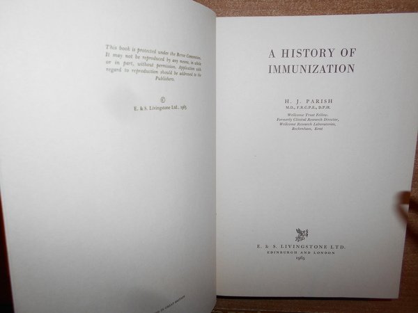 H.J. PARISH. Edinburgh and London, E. & S. Livingstone, 1965. A History of Immunization. In-8°, pelle edit. con titolo in oro al dorso, sovracopertina edit. con pellicola trasparente. xi, 355, (1) pp. con illustrazioni in tavole fuori testo. Ottimo esemplare. Uff. C - IV - 6