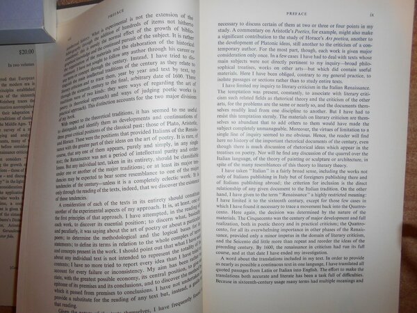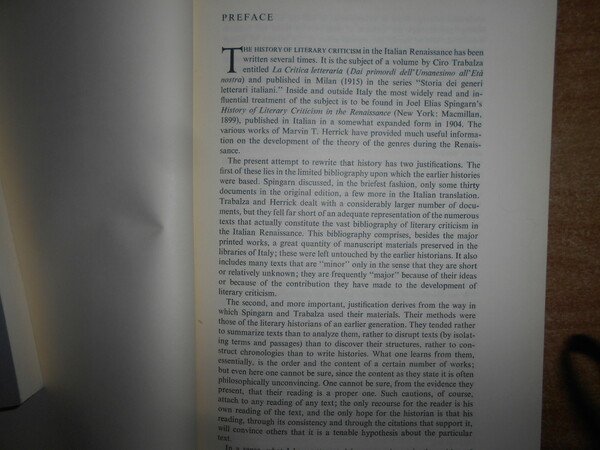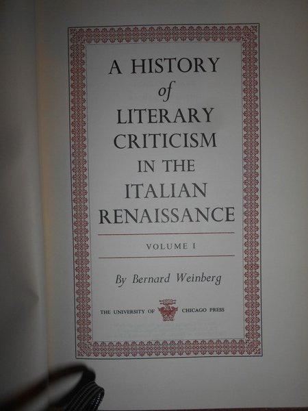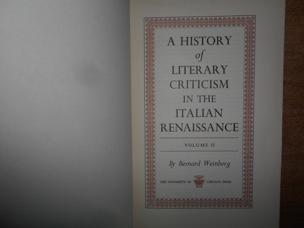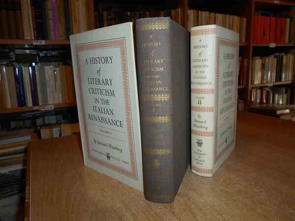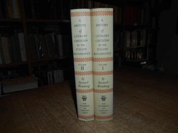 BERNARD WEINBERG. Chicago, The University of Chicago Press, 1961. A History of Literary criticism in the Italian Renaissance. 2 volumi in-8°, tela edit. con titoli in oro ai dorsi, sovracopertine. X, per complessive 1184 pp. (numerazione pagine continua). In ottimo stato di conservazione. Uff. B - I - 4