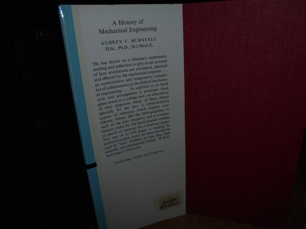 AUBREY F. BURSTALL. London, Faber and Faber, 1970. A History of Mechanical Engineering. In-16° grande, tela con titolo in oro al dorso, sovracopertina a col. 456 pp. con numerose illustrazioni nel testo. Come nuovo. Uff. C - II - 6