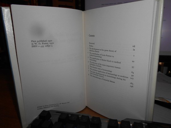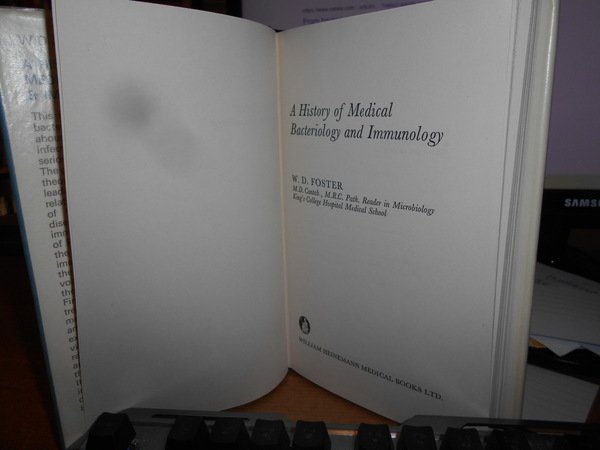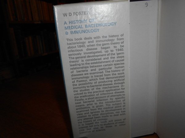 W. D. FOSTER. London, William Heinemann Medical Books, 1970. A History of Medical Bacteriology & Immunology. In-8° piccolo, tela nera edit. con titolo in oro al dorso, doppia sovracopertina una editoriale la seconda in pellicola trasparente. xi, 232 pp. con alcune figure in tavole fuori testo. Come nuovo. Uff. C - IV - 6