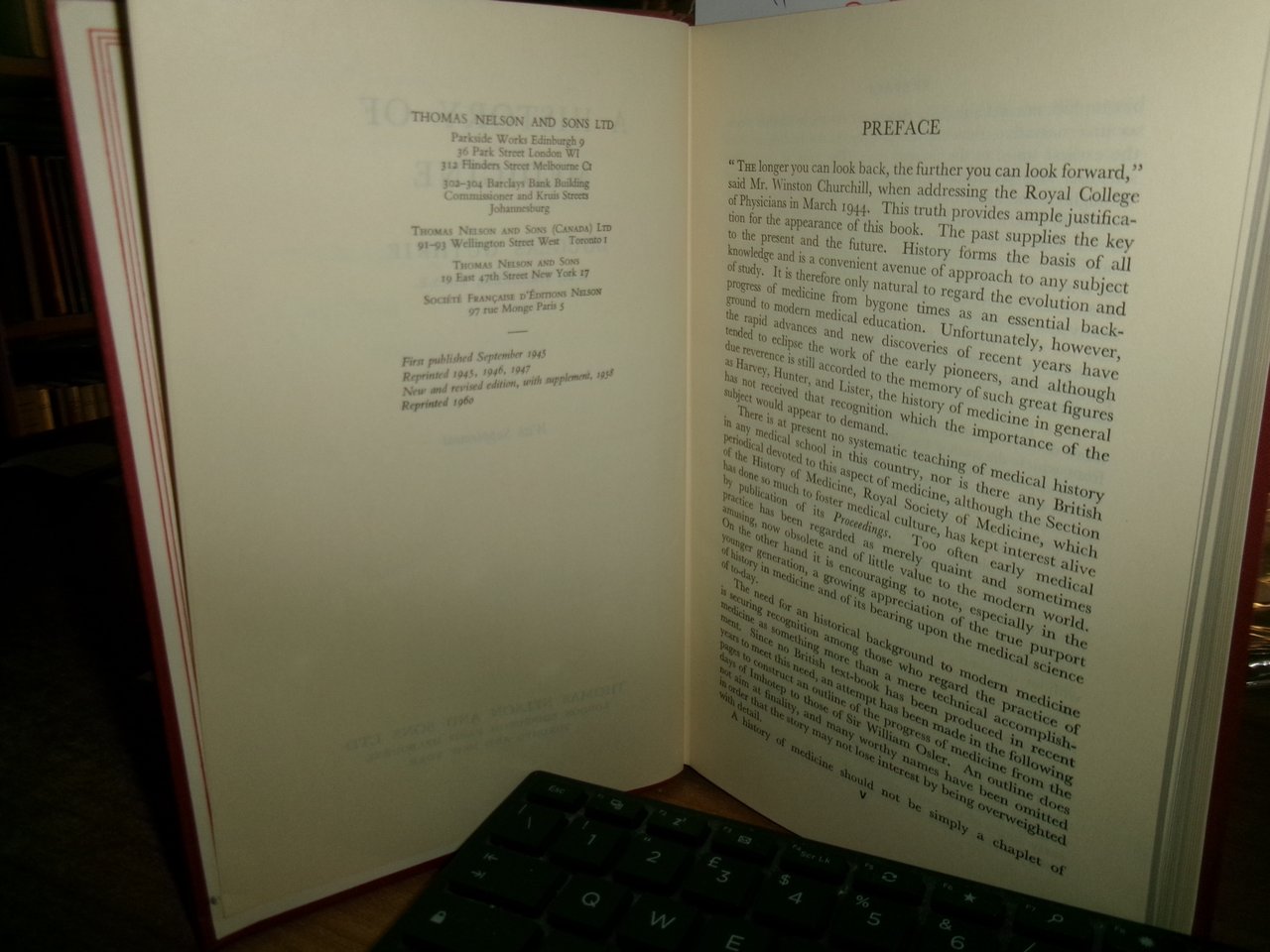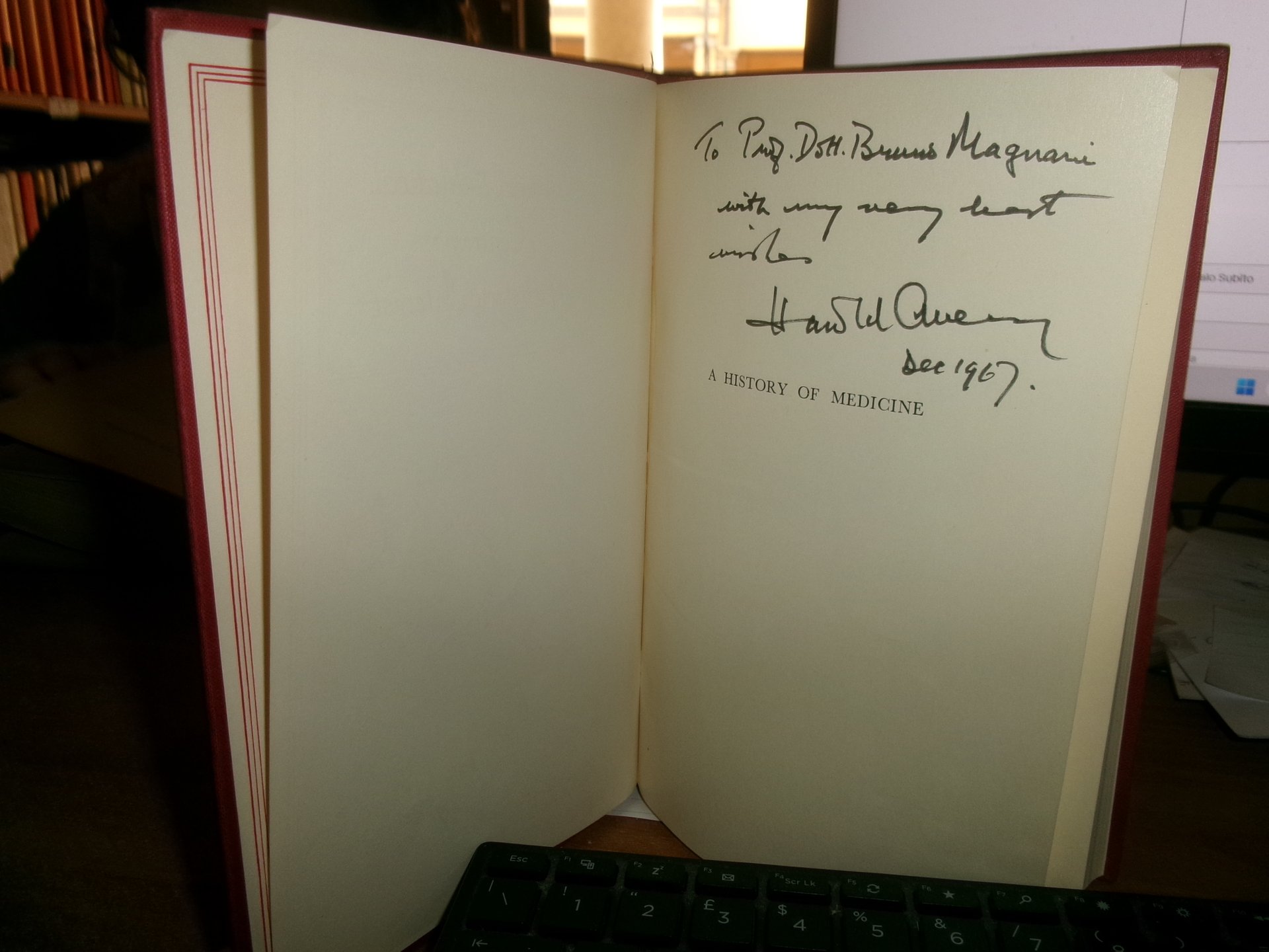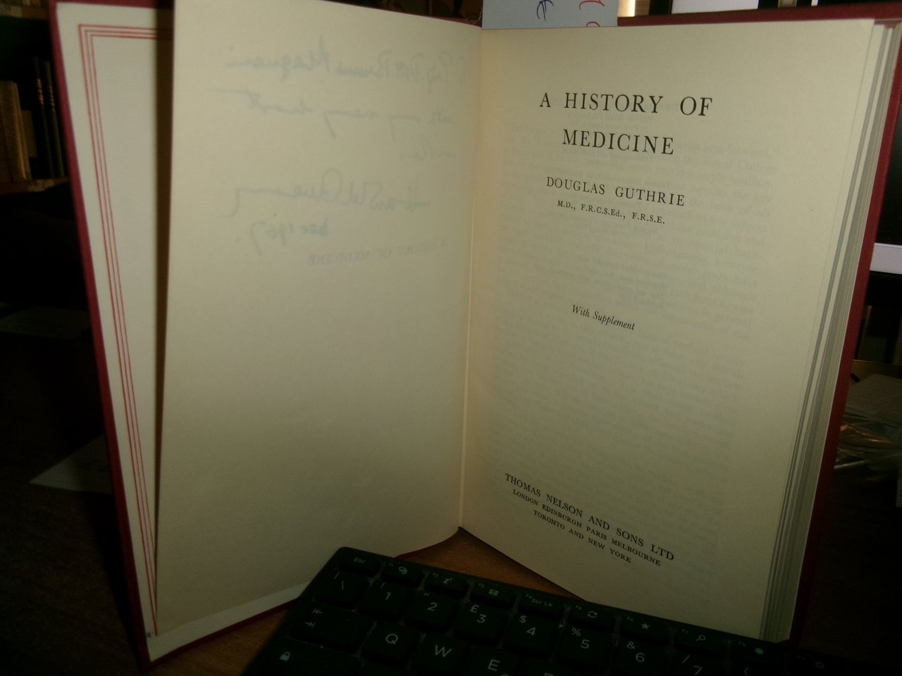 DOUGLAS GUTHRIE. London..., Thomas Nelson And Sons, 1960. A HISTORY OF MEDICINE. With Supplement. In-8°, tela edit. bordeaux con titolo in oro al dorso. xvi, 463 pp. con numerose tavole f.t. Ottimo esemplare con dedica al Prof. Bruno Magnani all' occhietto. Testo in inglese. Uff. C - III - 6