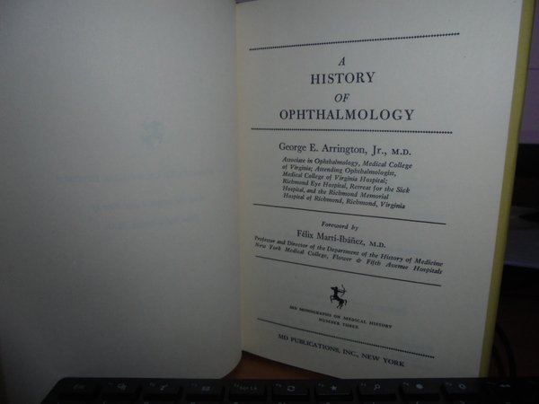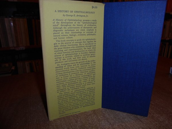 GEORGE E. ARRINGTON. New York, MD Monographs on Medical, 1959. A History of OPHTHALMOLOGY. In-16° grande, tela bleu con titolo in oro al dorso e sovracopertina. xvii, 174 pp. In ottimo stato di conservazione. Uff. F - 5