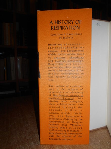 by LEON S. GOTTLIEB. Springfield - Illinois. U.S.A., Charles C. Thomas, 1964. A History of RESPIRATION. In-8°, tela con titolo in oro al dorso, sovracopertina edit. e pellicola trasparente di protezione. xii, 121 pp. con alcune illustrazioni e ritratti n.t. Come nuovo. Uff. C - IV - 4