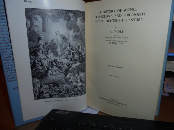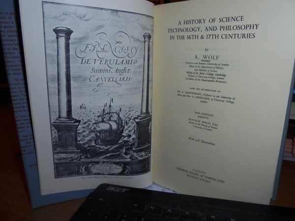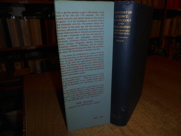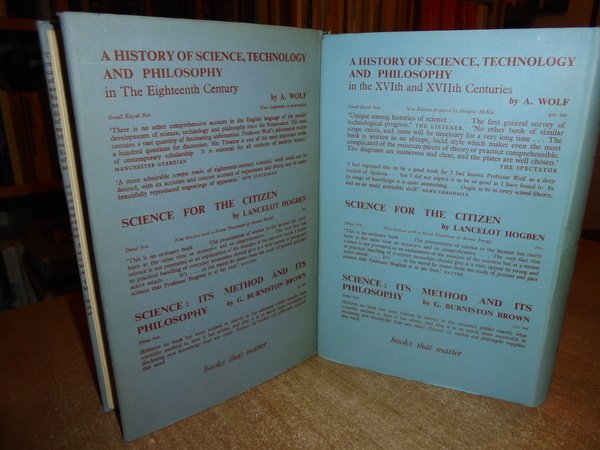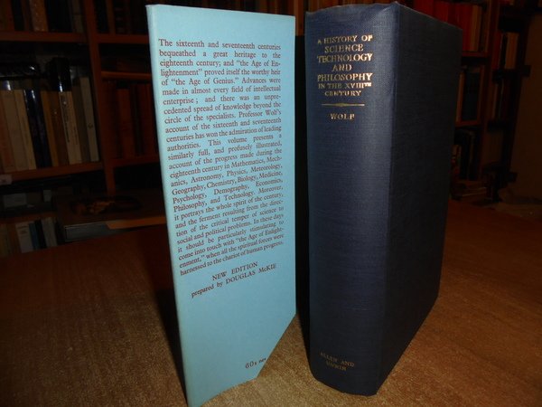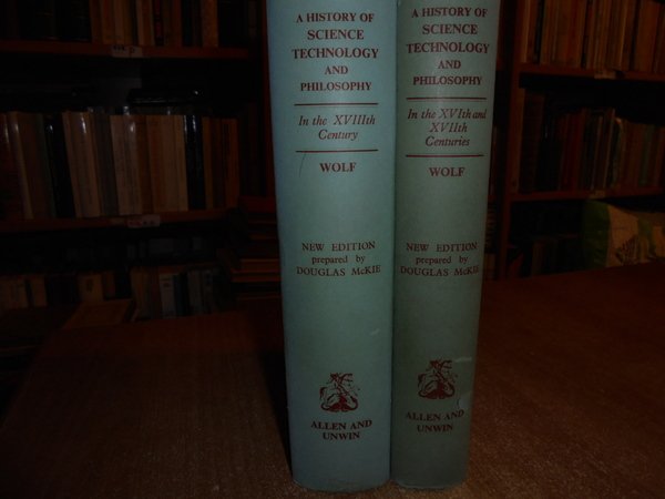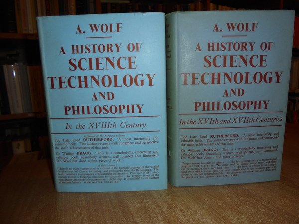 A. WOLF. London, George Allen & Unwin, 1950 - 1952. A HISTORY OF SCIENCE TECHNOLOGY AND PHILOSOPHY. 2 volumi in-8°, tela bleu edit. con titolo in oro sui dorsi, sovracopertine. I. vol. In the XVIth and XVIIth Centuries. xxvii, 692, (3) pp. con 316 illustrazioni f.t. II. vol. In the XVIIIth Century. 814 pp. con 345 illustrazioni f.t. Ottimi esemplari. Uff. C - III - 4