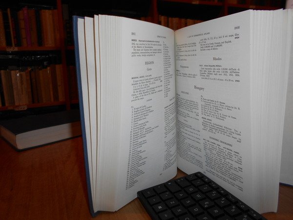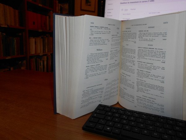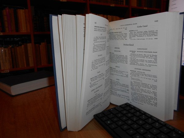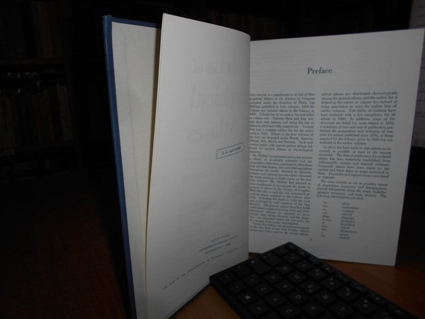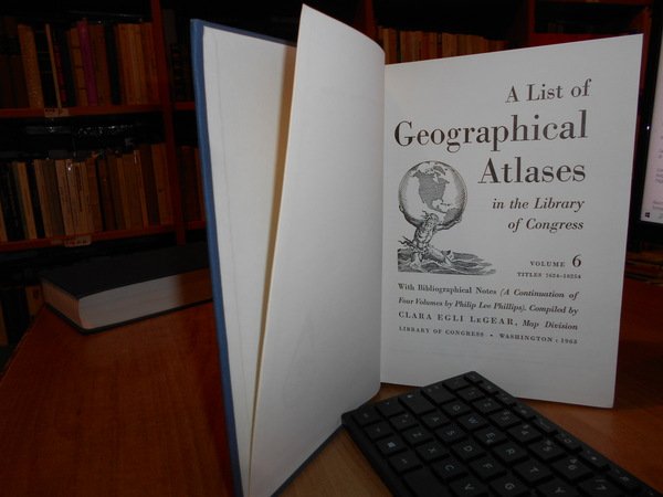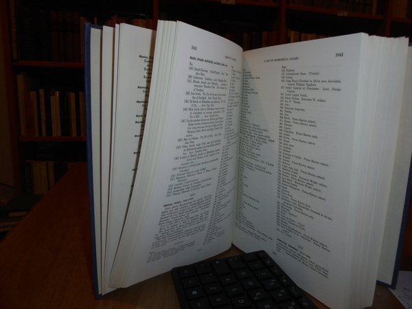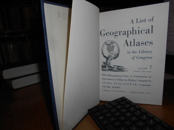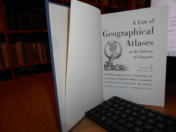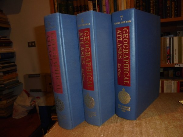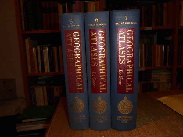 Clara Egli Le Gear. Washington, Library of Congress, 1958 - 1963 - 1973. A List of Geographical Atlases in the Library of Congress. 5/6/7. 3 volumi in-8° grande, tela bleu con titoli in oro ai dorsi. Volume 5. Titles 5325-7623. With Bibliographical Notes (A continuation of Four Volumes by Philip Lee Phillips). xlvii, 666 pp.; Volume 6. Titles 7624-10254. lxxii, 681 pp.; Volume 7. Titles 10255-18435. cxxx, 708 pp. Come nuovi. Uff. B - II - 7