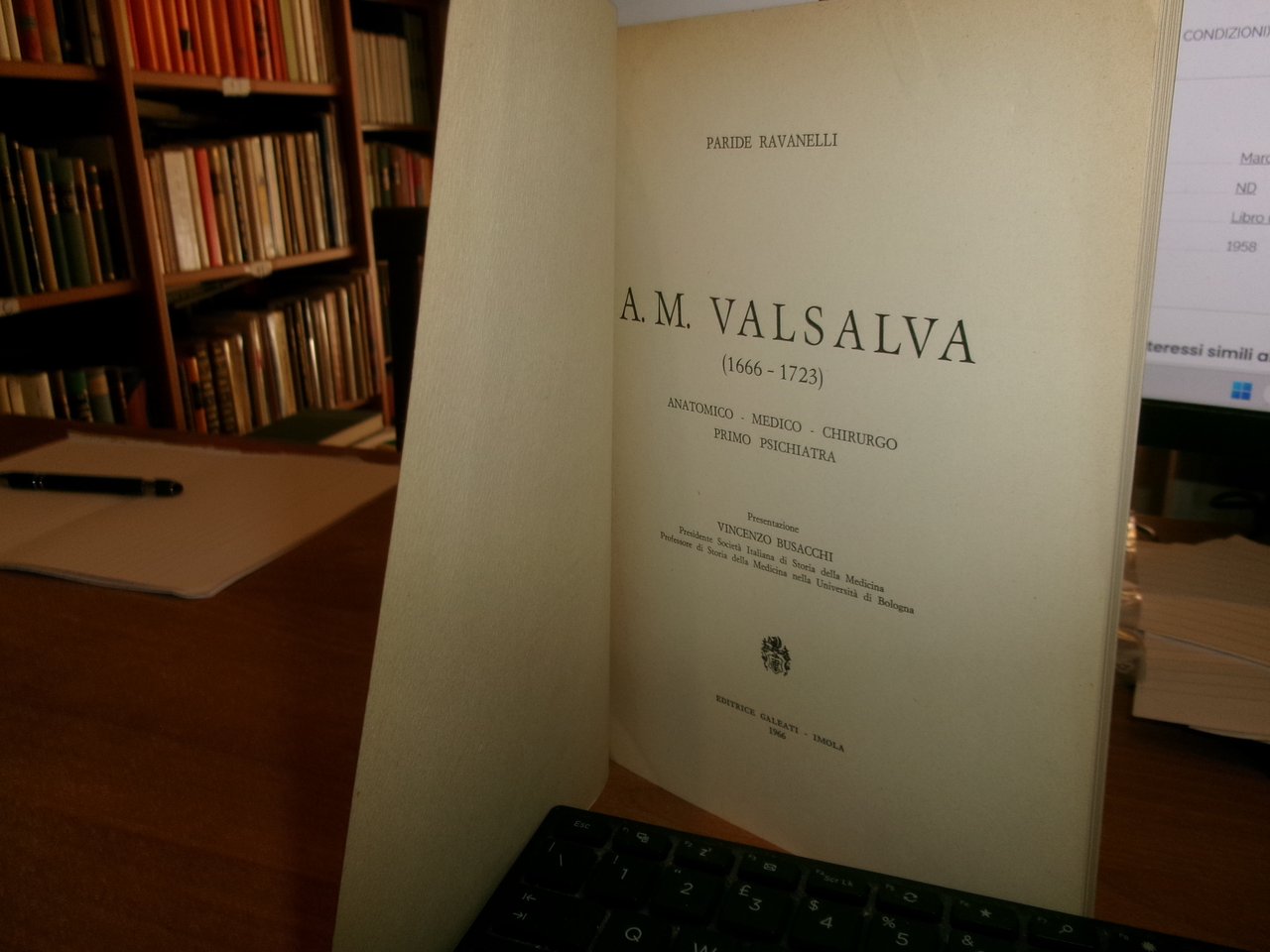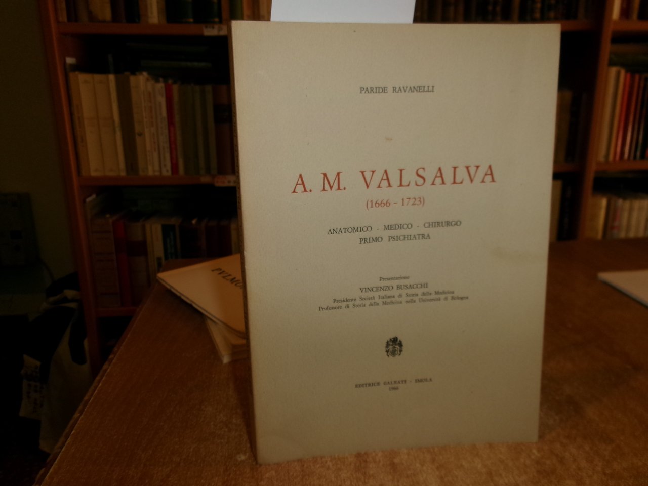 PARIDE RAVANELLI. Imola, Editrice Galeati, 1966. A. M. VALSAVA (1666-1723) Anatomico - Medico - Chirurgo - Primo Psichiatra. In-8°, br. edit. 110 pp. con ritratto. Ottimo stato. Neg. mob. 18