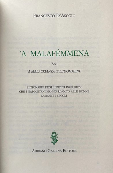 'A MALAFÉMMENA. ZOÈ. A MALACRIANZA 'E LLUOMMENE. DIZIONARIO DEGLI EPITETI INGIURIOSI CHE I NAPOLETANI HANNO RIVOLTO ALLE DONNE DURANTE I SECOLI