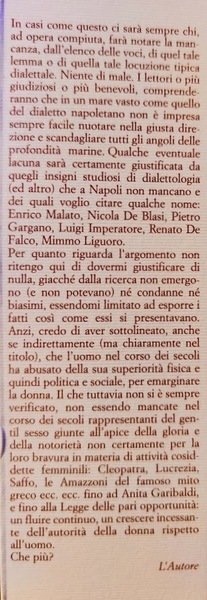 In casi come questo ci sarà sempre chi, ad opera compiuta, farà notare la mancanza, dall'elenco delle voci, di quel tale lemma o di quella tale locuzione tipica dialettale. Niente di male. I lettori o più giudiziosi o più benevoli, comprenderanno che in un mare vasto come quello del dialetto napoletano non è impresa sempre facile nuotare nella giusta direzione e scandagliare tutti gli angoli delle profondità marine. Qualche eventuale lacuna sarà certamente giustificata da quegli insigni studiosi di dialettologia (ed altro) che a Napoli non mancano e dei quali voglio citare qualche nome: Enrico Malato, Nicola De Blasi, Pietro Gargano, Luigi Imperatore, Renato De Falco, Mimmo Liguoro. Per quanto riguarda l'argomento non ritengo qui di dovermi giustificare di nulla, giacché dalla ricerca non emergono (e non potevano) né condanne né biasimi, essendomi limitato ad esporre i tratti cosi come essi si presentavano. Anzi, credo di aver sottolineato, anche se indirettamente (ma chiaramente nel titolo), che l'uomo nel corso dei secoli ha abusato della sua superiorità fisica e quindi politica e sociale, per emarginare la donna. Il che tuttavia non si è sempre verificato, non essendo mancate nel corso dei secoli rappresentanti del gentil sesso giunte all'apice della gloria e della notorietà non certamente per la loro bravura in materia di attività cosiddette femminili: Cleopatra, Lucrezia, Saffo, le Amazzoni del famoso mito greco ecc. ecc. fino ad Anita Garibaldi, e fino alla Legge delle pari opportunità: un fluire continuo, un crescere incessante dell'autorità della donna rispetto all'uomo. Che più?.