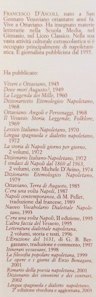 FRANCESCO D'ASCOLI, nato a San Gennaro Vesuviano ottantatré anni fa. Vive a Ottaviano. Ha insegnato materie letterarie Ginnasio, nel Liceo Classico. Nella sua vasta attività culturale extrascolastica si è occupato principalmente di napoletanistica. E giornalista pubblicista dal 1955. nella Scuola Media, nel Ha pubblicato: Veseri e Ottaviano, 1945 Dove mori Augusto?, 1949 La Leggenda dei Mille, 1960 Dizionarietto Etimologico Napoletano, 1968 Ottaviano: Angoli e Personaggi, 1968 Vesuvio: Storia, Leggende, Folklore, 1969 Lessico Italiano-Napoletano, 1970 Lingua spagnuola e dialetto napoletano, 1972 La storia di Napoli giorno per giorno, 2 volumi, 1972 Dizionario italiano-Napoletano, 1972 I sindaci di Napoli dal 1860 al 1963, 2 volumi, con Michele D'Avino, 1974 Dizionario Etimologico Napoletano, 1979 Ottaviano, Terra di Augusto, 1985 C'era una volta Napoli, 1987 Napoli contemporanea, di M. Pellet, traduzione dal francese, 1989 Nuovo Vocabolario Dialettale Napoletano, 1993 Cera una volta Napoli, II edizione, 1995 L'altra faccia del Vesuvio, 1995 Letteratura dialettale napoletana, 2 volumi, storia e testi, 1996 L'Eruzione del 1631, di G. B. Bergazzano, traduzione e commento, 1997 itinerari vesuviani, 1998 La filosofia popolare napoletana, 1999 Le opere e i giorni di Enzo Bonagura, 2001 Rimario della poesia napoletana, 2001 Dizionario dei sinonimi e dei contrari, 2002 Lingua spagnuola e dialetto napoletano, 2" edizione riveduta e aggiornata, 2003.