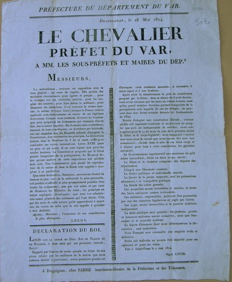 A Draguignan, chez Fabre imprimeur libraire, 1814. 47 x 36 cm affiche sur papier bleuté. Déclaration au roi du 2 mai 1814 relative à la rectification présentée par le sénat, et a la garantie des bases de cette même constitution. Projet de Constitution de Louis Philippe.