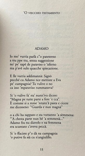 Soggetti: Antico Testamento, Testi Sacri, Scrittura, Sacre Scritture, Lingua napoletana, Dialetto napoletano, Poesie, Sonetti, Personaggi biblici, Bibbia in napoletano, Poesia, Letteratura sacra, Episodi storici, Parabole, Cultura, Traduzioni, Adamo, Eva, Figliuol prodigo, Chicche librarie, Libri Vintage Fuori catalogo, Collezionismo, Curiosità, Varia, Raccolte poetiche dialettali, Dio, Dialoghi, Padre eterno, 'Nparatorio, Personaggi illustri, Canti celebrativi, Canzoni, Arte partenopea, Napoli, Profeti, Elia, Mosè, Giacobbe, Esaù, Gerusalemme, Caino, Davide, Gerico, Saul, Luna, Natale, Vomero, Totò, Mercato, Enrico Caruso, Salvatore Di Giacomo, Ferdinando Russo, Quartieri, Miracolo di San Gennaro, Sangue, Tradizioni popolari, Purgatorio, Glossario, Termini, Religione, Old Testament, Sacred Texts, Scripture, Holy Scriptures, Neapolitan language, Neapolitan dialect, Poems, Sonnets, Biblical characters, Bible in Neapolitan, Poetry, Sacred literature, Historical episodes, Parables, Culture, Translations, Adam, Eve, Prodigal son, Chicche books, Out of Print Books, Collectibles, Curiosities, Various, Dialectal poetic collections, God, Dialogues, Eternal Father, Famous people, Celebratory songs, Songs, Neapolitan art, Naples, Prophets, Elijah, Moses, Jacob, Jerusalem, Cain, David, Jericho, Moon, Christmas, Market, Neighborhoods, Miracles, Blood, Popular traditions, Purgatory, Glossary, Terms
