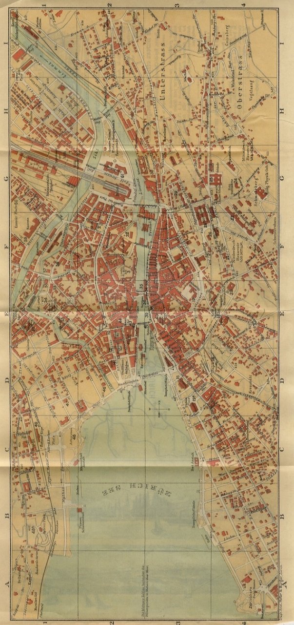 Zurich, Art Institut Orell Fussli, 1893, in-16, br. editoriale figurata in litografia (lievi mancanze al dorso, manca l'anngolo superiore esterno della copertina posteriore, pp. 48. Con una pianta a colori ripiegata della città (pianta che reca al verso cartine geografiche e panorami alpini) e illustrazioni n.t.