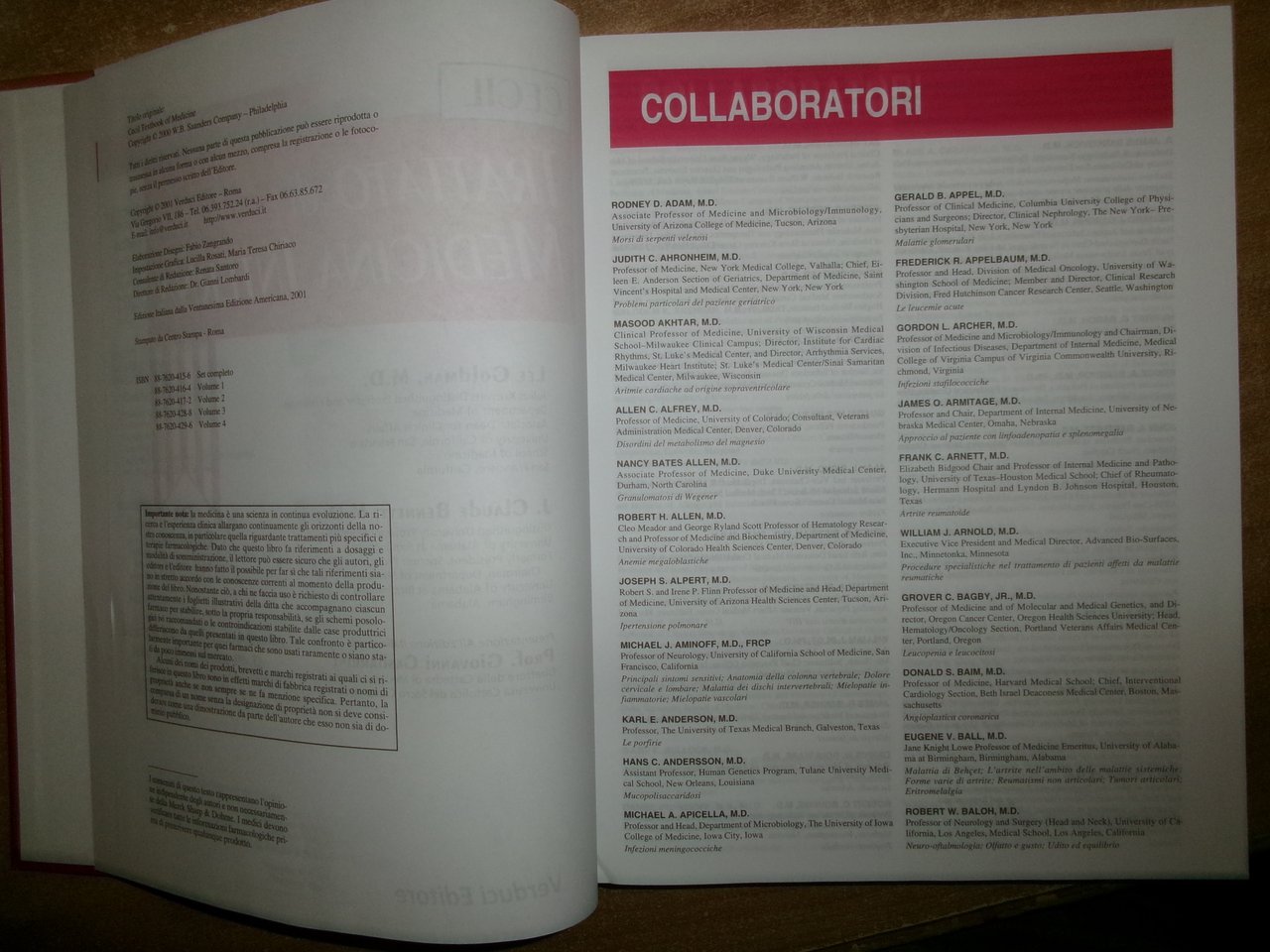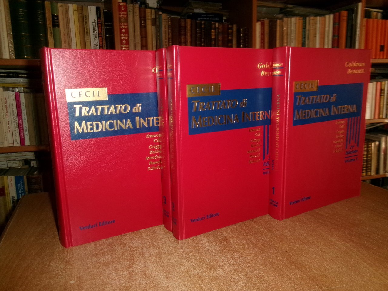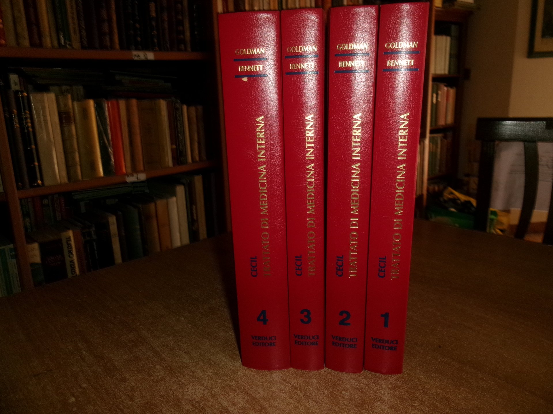 AA. VV. CECIL Trattato di Medicina Interna - GOLDMAN BENNETT. 21a Edizione. Roma, Verducci Editore, 2001. 4 volumi in-4°, similpelle e oro. xxxvi, xxxii, xviii, xvi, per complessive 2587 pp. con numerose illustrazioni in nero n.t. e a colori in tavole fuori testo . Ottimo esemplare. Uff. stanz. TV mob fronte nostro.