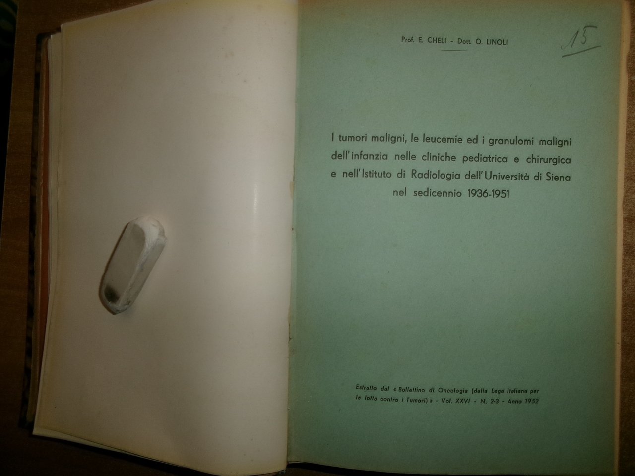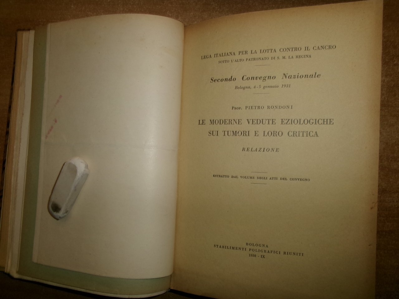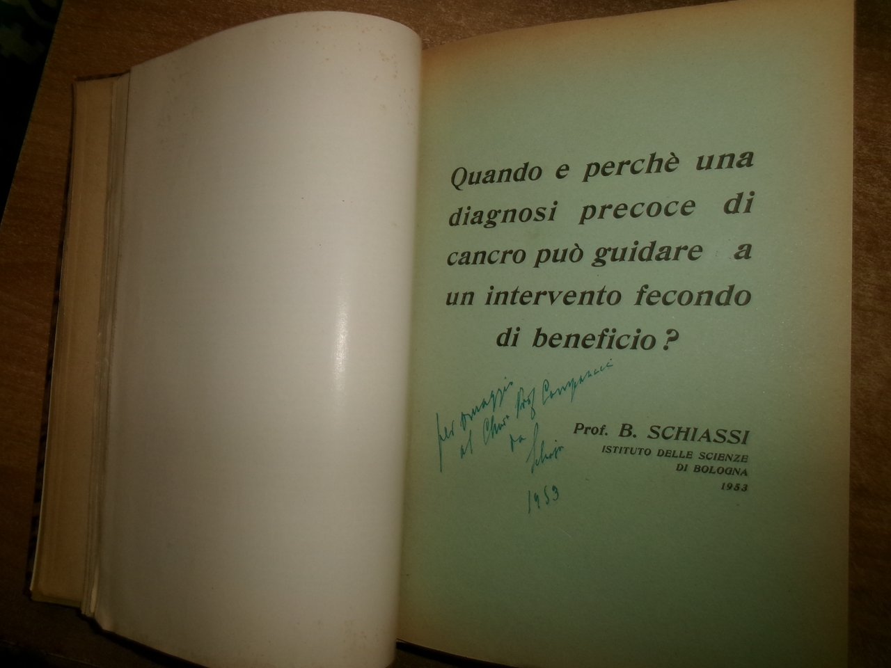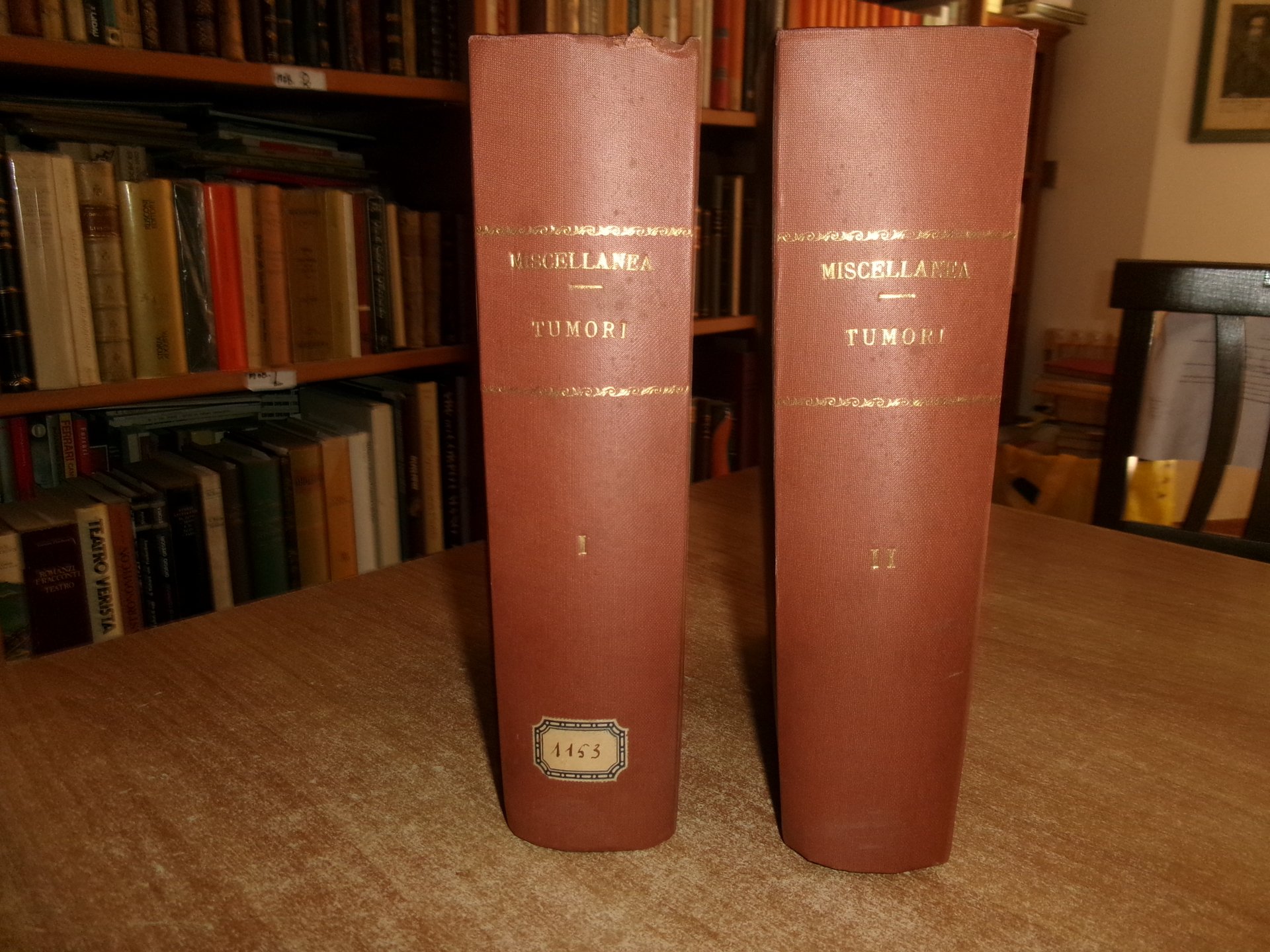 AA.VV. MISCELLANEA di numerosi estratti/opuscoli riguardanti i tumori. 1930/1950.Raccolta di innumerevoli estratti/opuscoli riguardanti i tumori. 2 volumi in-8°, m-tela con titolo in oro al dorso con numerose illustrazioni anche a colori. Ottimo stato con testi la maggior parte in italiano ma anche in francese e tedesco. Ben conservati con dediche degli Autori firmate dedicate al Prof. Campanacci. Uff. salon. sporta 9