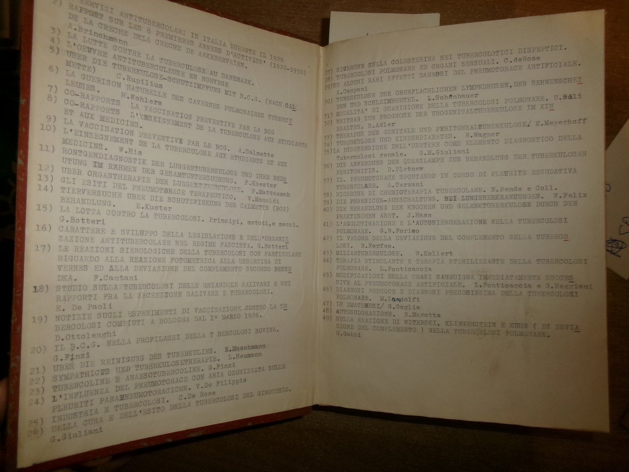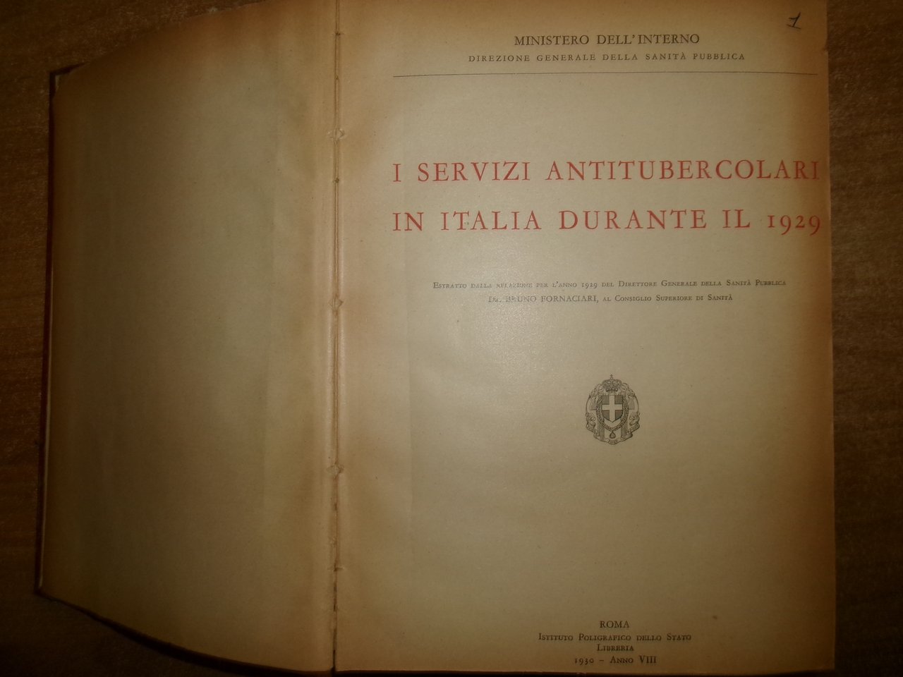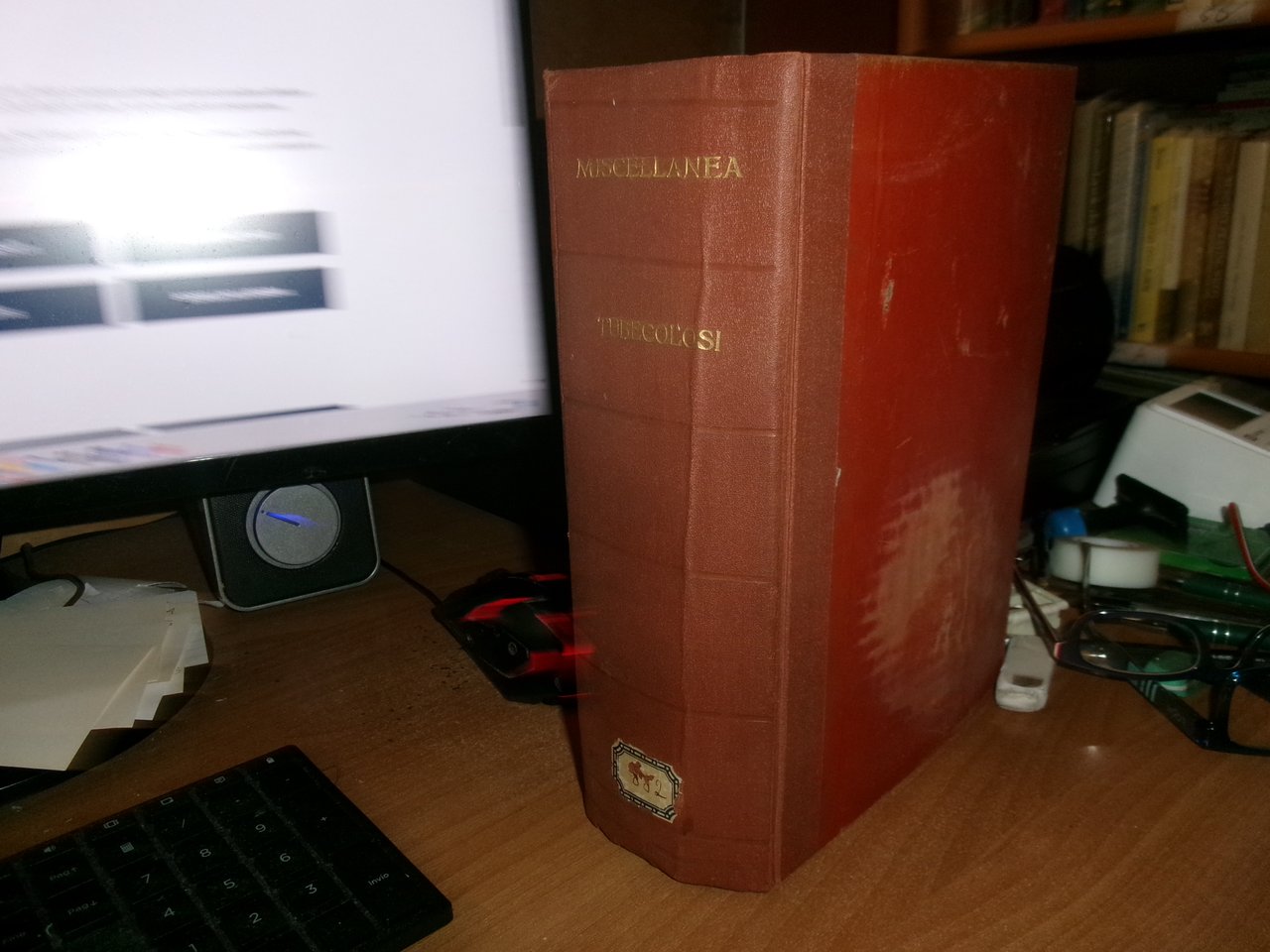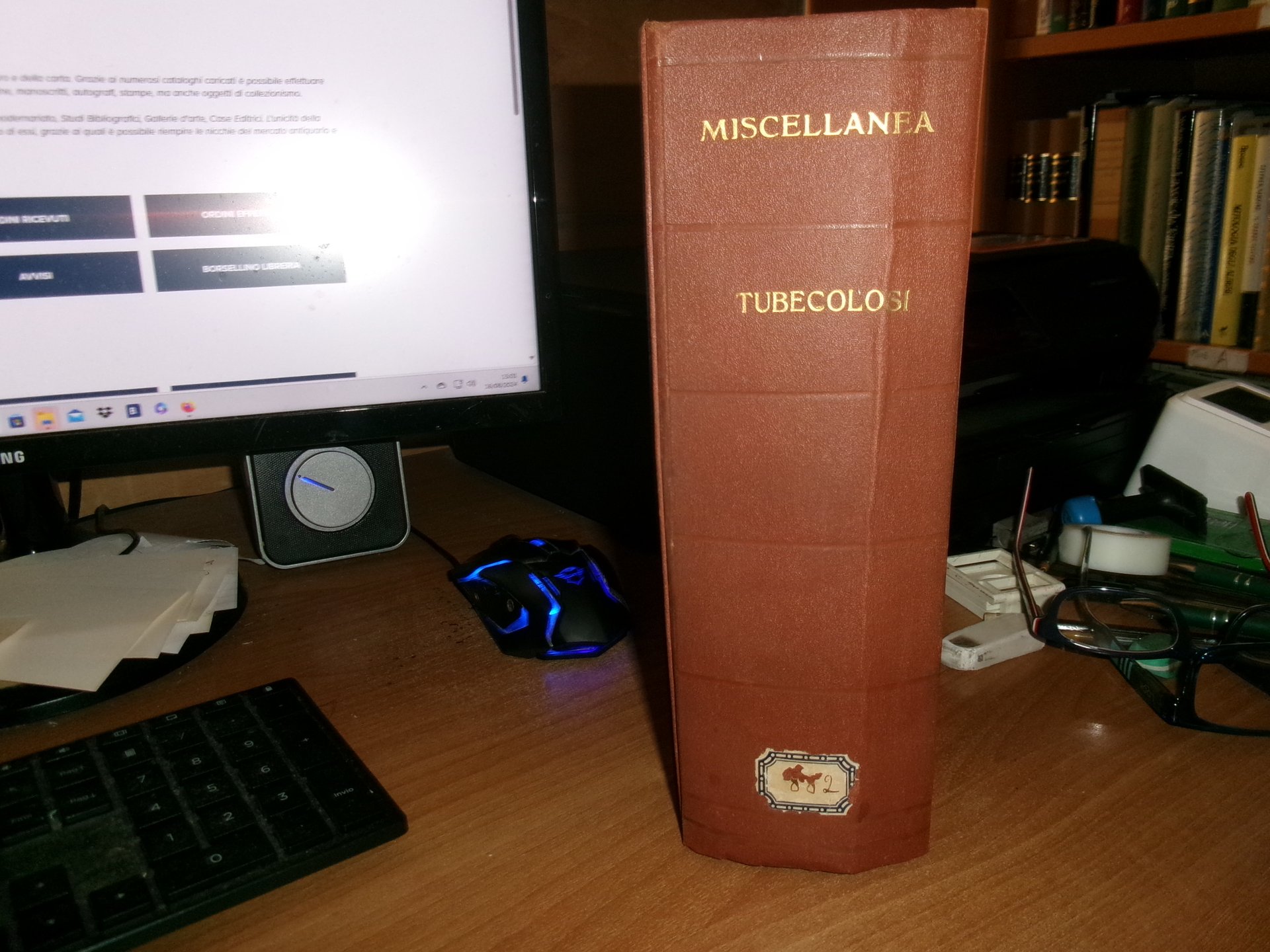AA.VV. MISCELLANEA di numerosi opuscoli riguardanti la TUBERCOLOSI 1930. Raccolta di numerosi opuscoli legati assieme in un volume in-8°, m-tela con titolo in oro sul dorso con illustrazioni n.t. Scoloritura nei piani ma ben conservato. Non è presente un fotografia in una pagina. Testo in italiano/francese/tedesco. Salone sporta 4