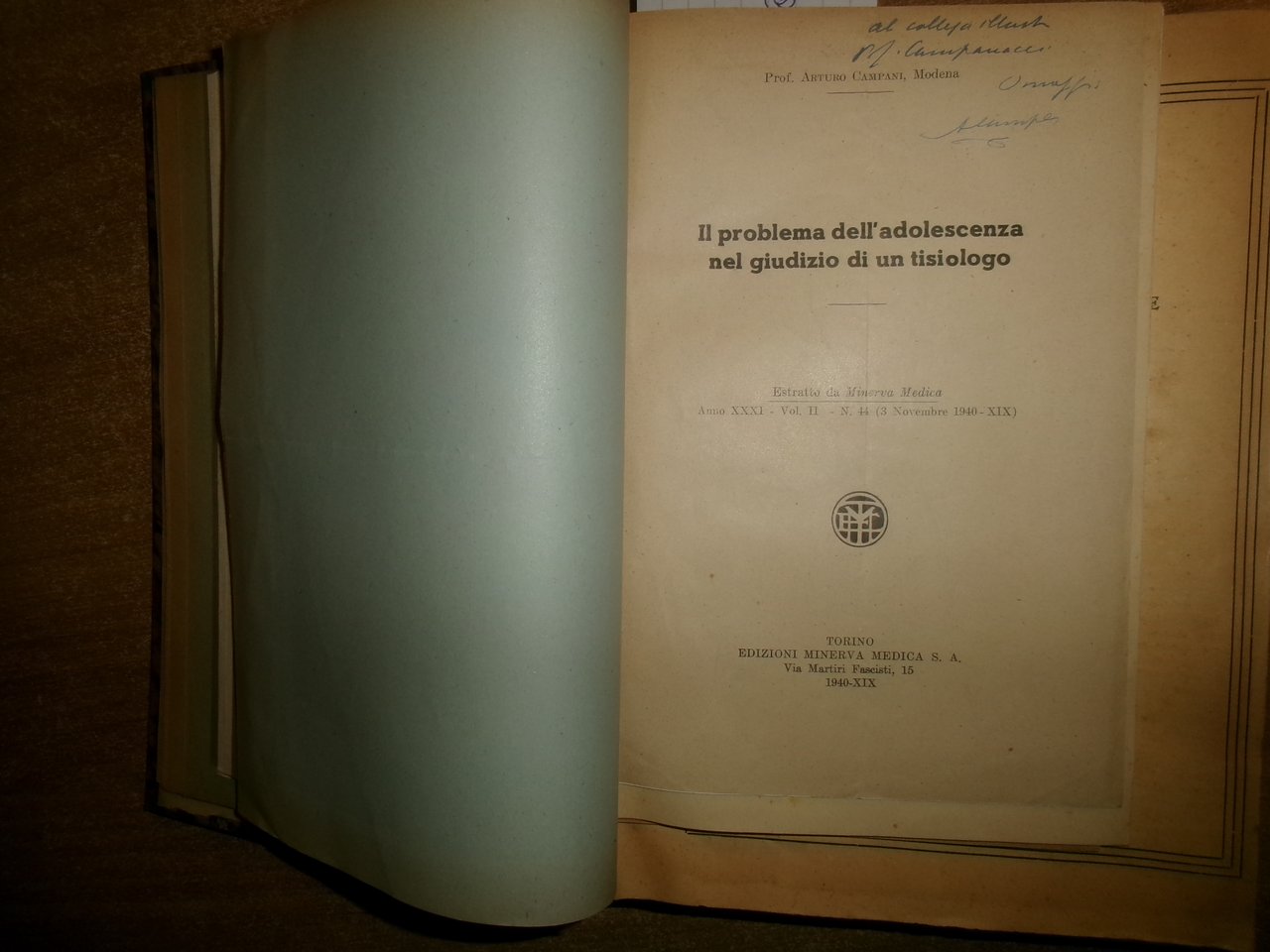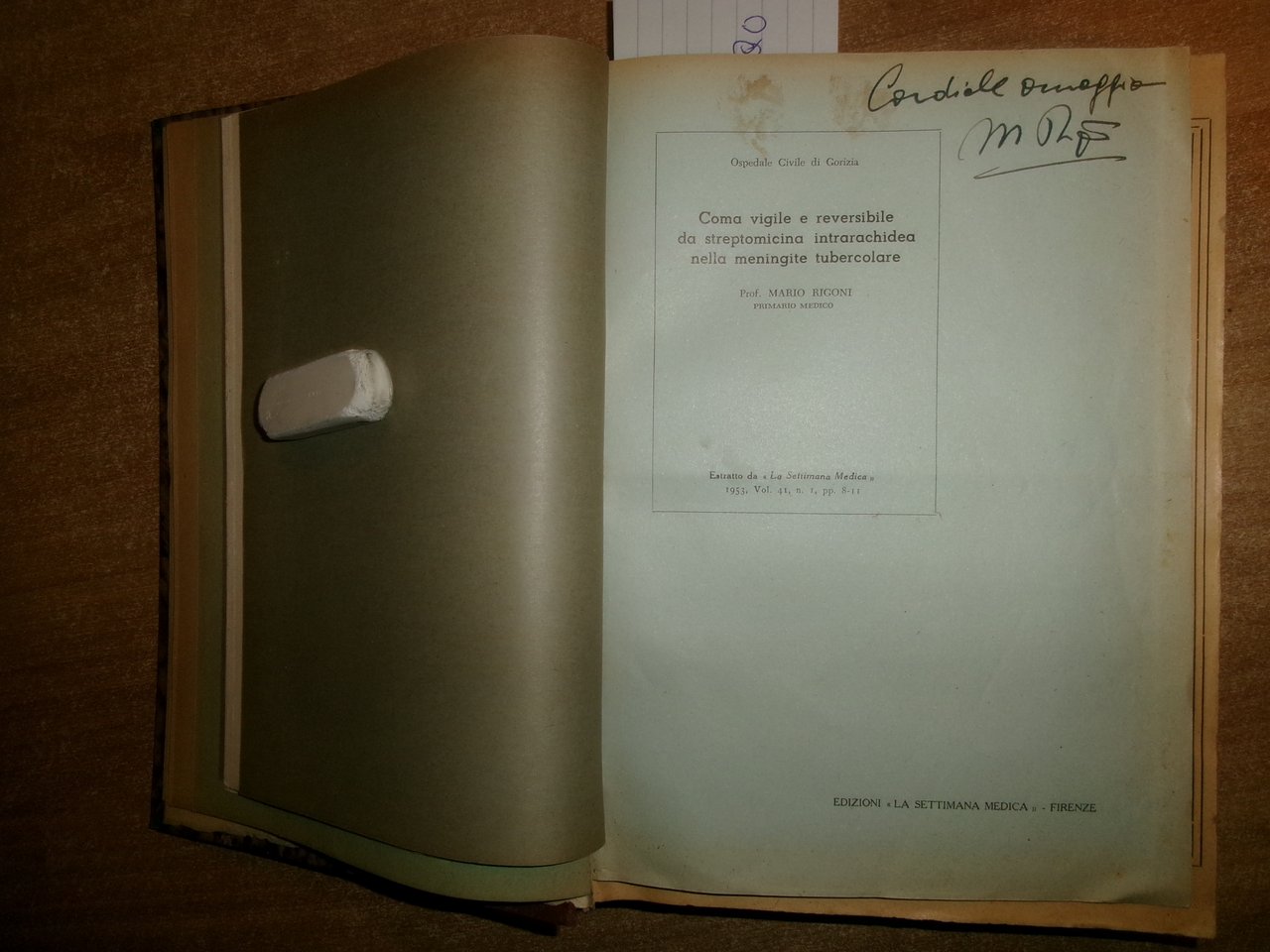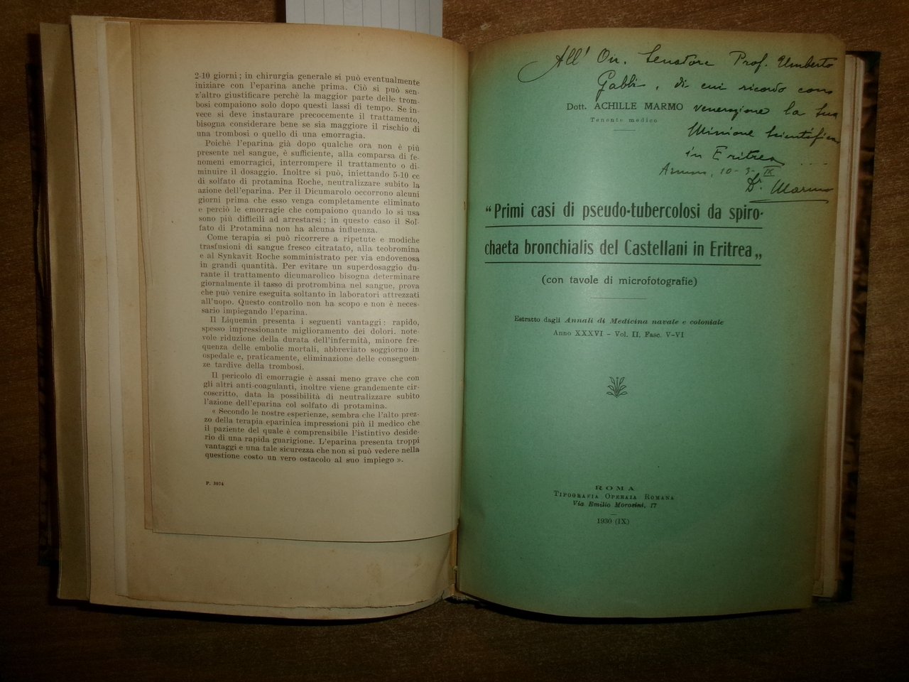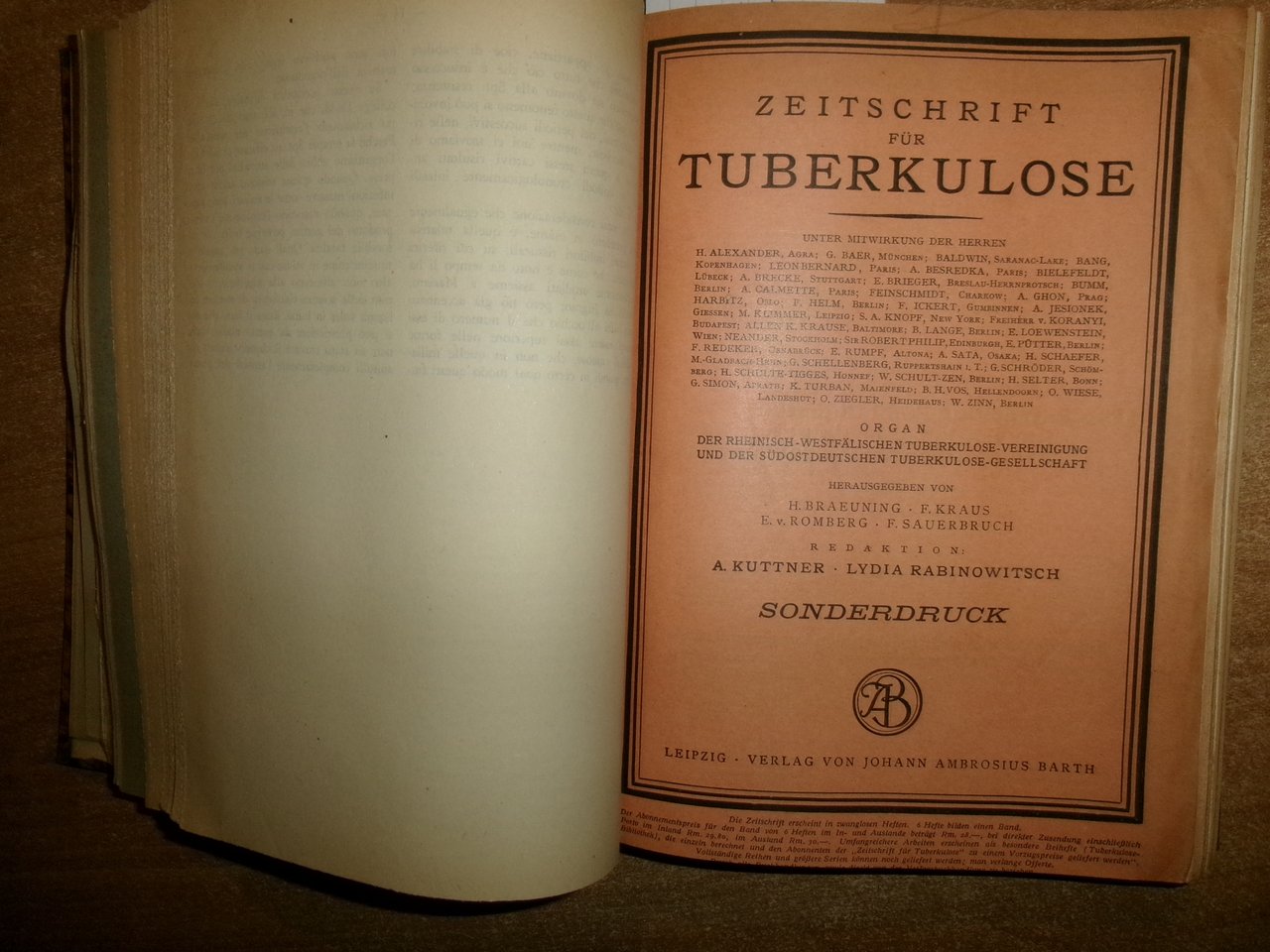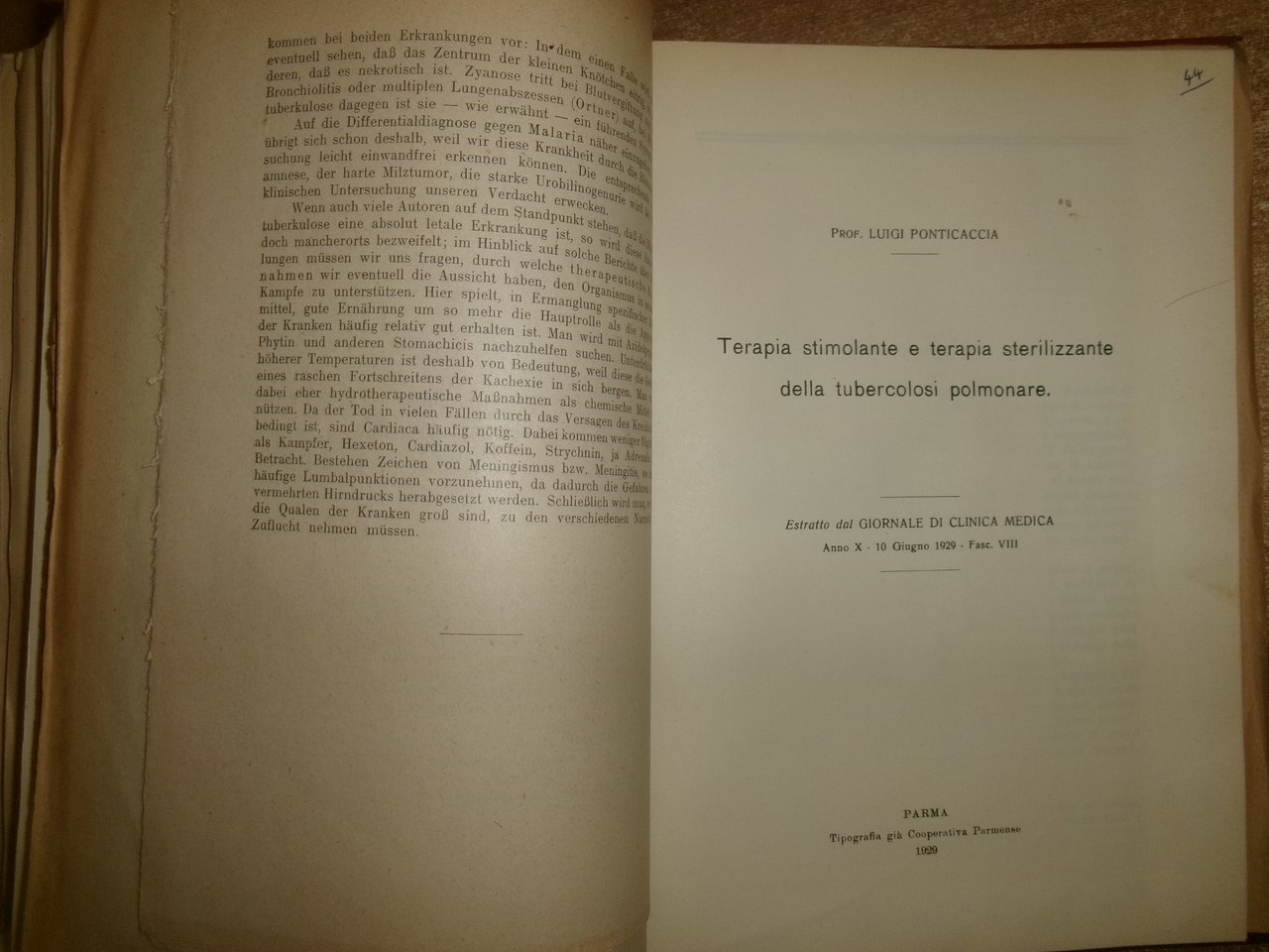 AA.VV. MISCELLANEA di numerosi opuscoli riguardanti la TUBERCOLOSI 1930. Raccolta di numerosi opuscoli legati assieme in un volume in-8°, m-tela con titolo in oro sul dorso con illustrazioni n.t. Scoloritura nei piani ma ben conservato. Non è presente un fotografia in una pagina. Testo in italiano/francese/tedesco. Salone sporta 4