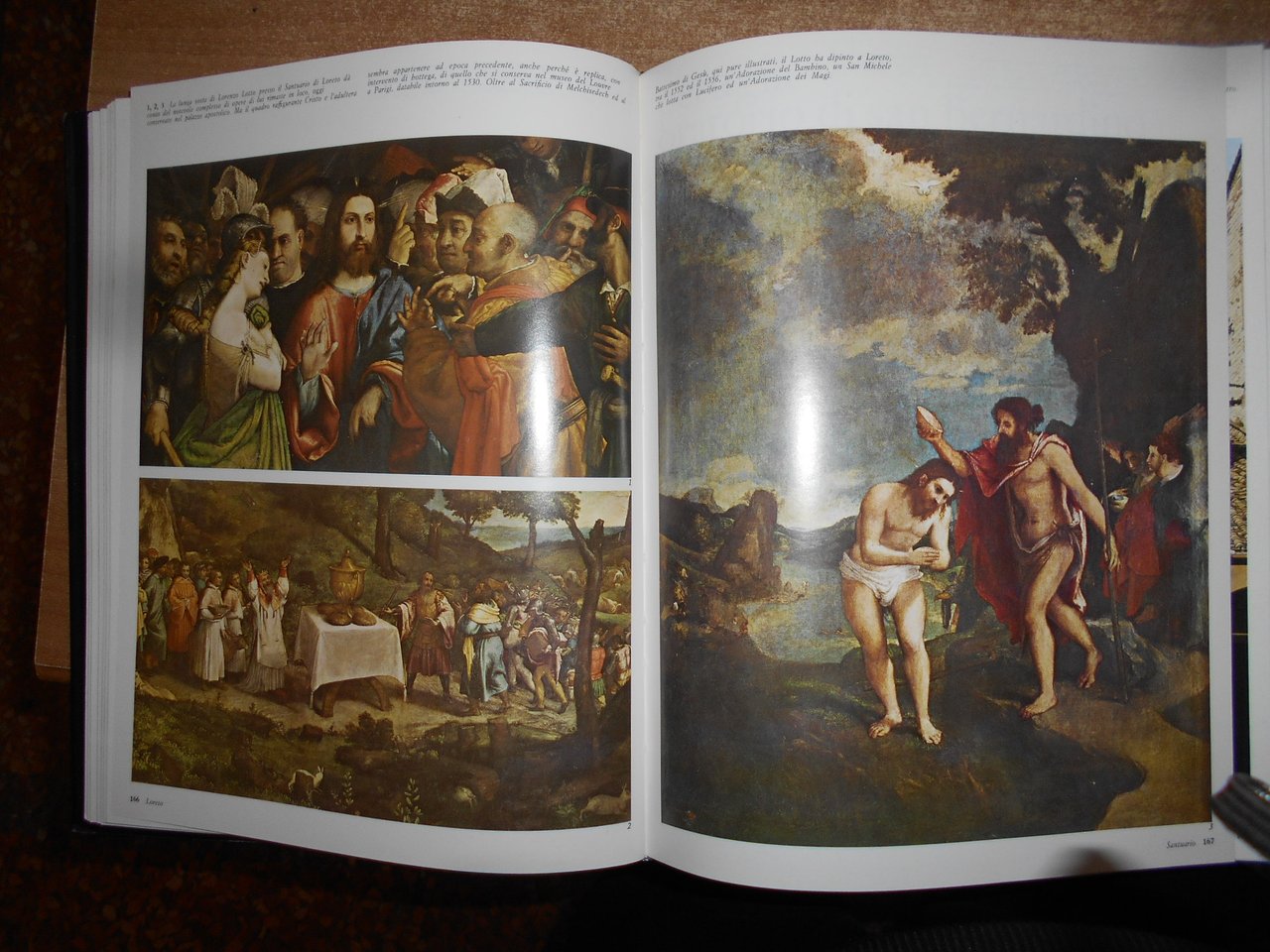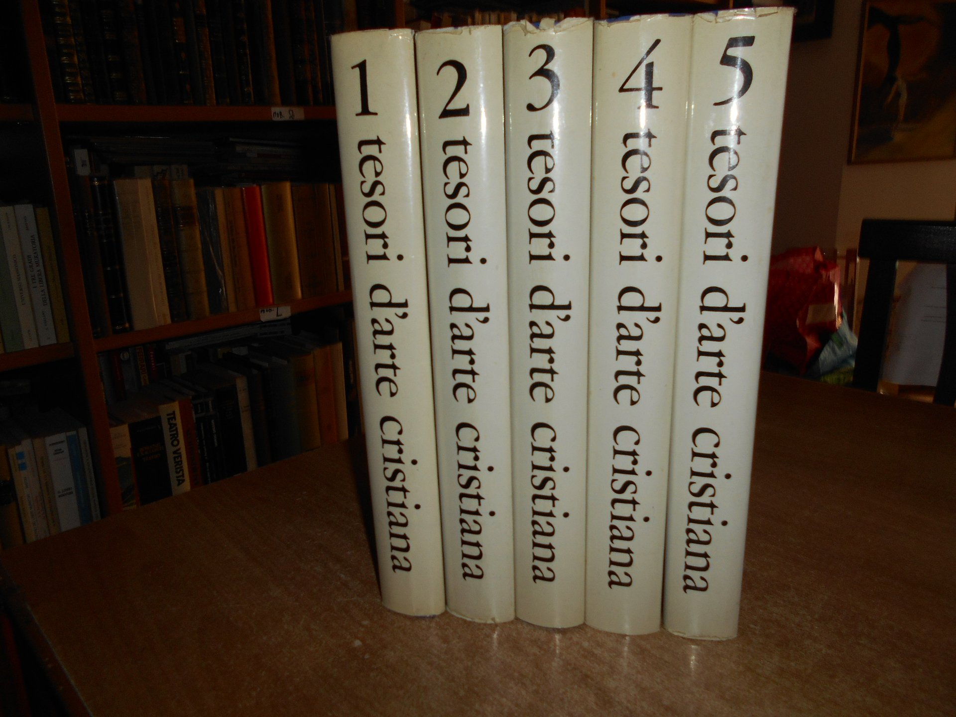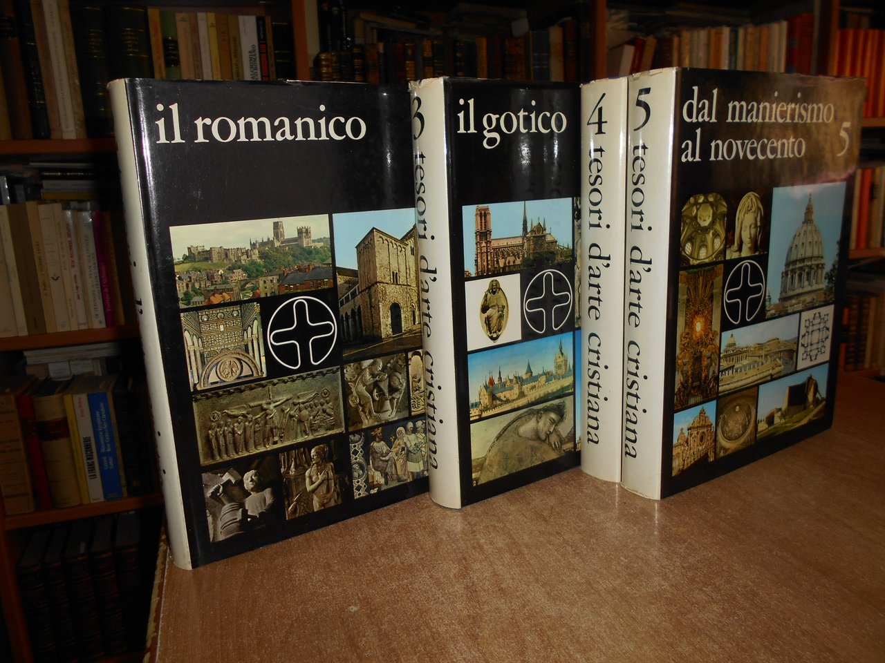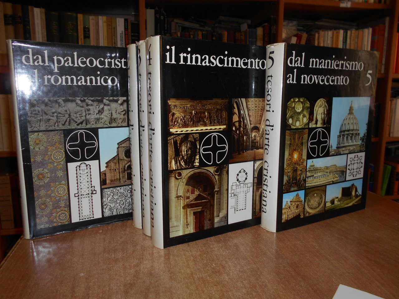 AA. VV. TESORI d' ARTE CRISTIANA. 5 volumi. Bologna, S.P.A. Poligrafici il Resto del Carlino, 1966. In-4°, similpelle bleu con fregi e titoli dorati ai dorsi, sovracopertine ill. a col. Vol. I. dal Paleocristiano al Romanico xi, 570 pp.; Vol. II. Il Romanico viii, 570 pp.; Vol. III. Il Gotico viii, 572 pp.; Vol. IV. Il Rinascimento viii, 572 pp.; Vol. V. Dal Manierismo al Novecento viii, 598 pp. I 5 volumi sono corredati da centinaia di illustrazioni a colori e in bianco e nero anche a piena pagina. Alcune sovracopertine presentano lievi strappetti al margine superiore ma volumi in ottimo stato di conservazione. Uff. stanzetta III - 7