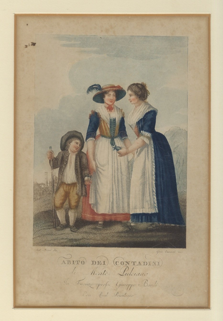 Abito dei contadini di Monte Pulciano. [Tavola proveniente dall'album “I contadini della Toscana espressi al naturale secondo le diverse loro vestiture in sessanta stampe a colori”].