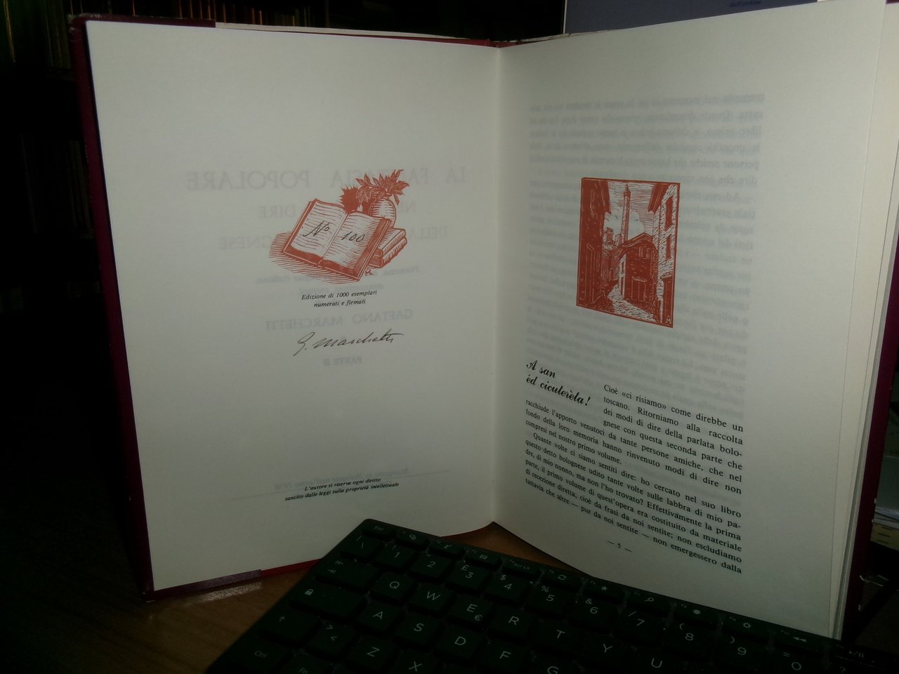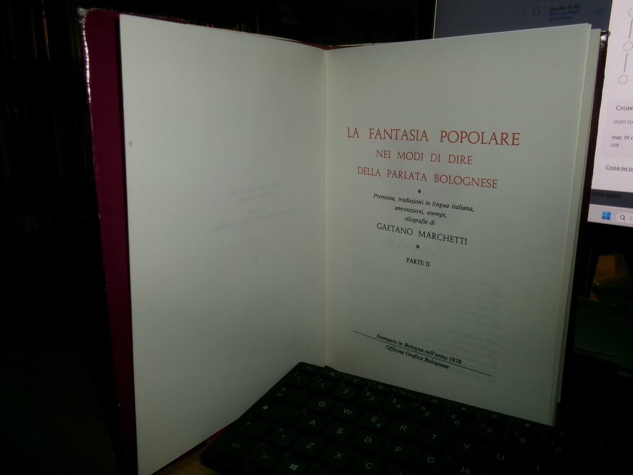 di GAETANO MARCHETTI. Bologna, Officina Grafica Bolognese, 1977/78. ACSÉ, PAR MOD ED DIR. La fantasia popolare noi modi di dire della parlata bolognese. Edizione di 800 esemplari firmati e numerati. 2 volumi in-8°, tela edit. rossa con titoli in oro sui piani e ai dorsi, sovracopertine. 191, 191, 191 pp. In ottimo stato di conservazione. Neg. Bol. mob. 20