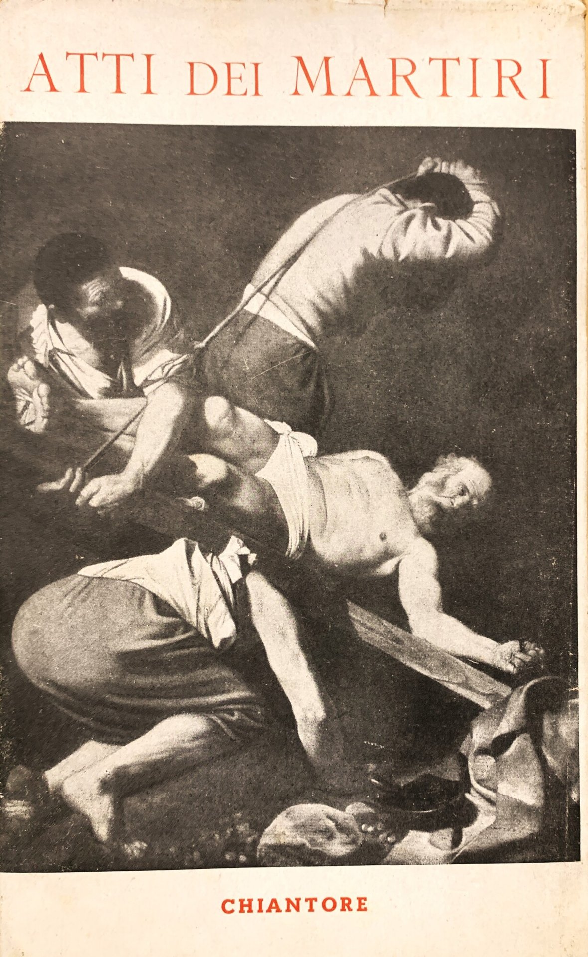 I ed. della raccolta: 30 aprile 1945. Testi in latino. XVI grande/ 276/ bross./ sovraccoperta in carta bianca con titoli in rosso e in nero e con illustrazioni in b/n ai piatti (primo piatto: Michelangelo Merisi detto il Caravaggio, Crocifissione di San Pietro, 1600-1. Roma, Chiesa di Santa Maria del Popolo - ultimo piatto: lucerna a olio). Con illustrazioni in b/n in tavole patinate f.t.. Stato buono (usura della sovraccoperta ai margini - sovraccoperta leggermente brunita - timbri bibliotecari annullati - quasi interamente intonso - pagine brunite). Indice: Gli Atti dei Martiri. Introduzione; Giovanni Barra (L'origine degli Atti dei Martiri - Alterazioni subite dagli Atti dei Martiri - Criteri di autenticità - Gli Atti dei Martiri e la storia letteraria) - Atti dei Martiri Scillitani - Martirio delle SS. Perpetua e Felicita - Atti di Acacio - Atti di Massimo - Atti preconsolari di S. Cipriano - Atti di Montano e Lucio - Martirio di Fruttuoso - Atti di Massimiliano - Atti di Felice - Martirio di Ireneo - Atti di Giulio - Atti di Claudio, Asterio e compagni - Atti di Crispina - Atti di Filea e Filoromo - Annotazioni.