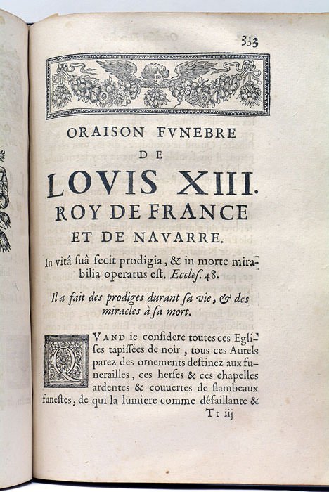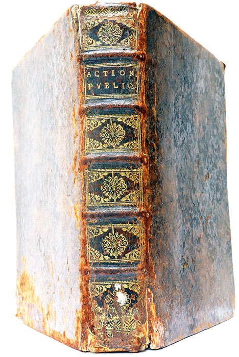13 feuillets. 94 pages. 1 feuillet. 576 pages. (24x18 Cm). Plein veau. Dos à nerfs doré. Titre doré. Charnières fendues. Coins et coiffes émoussés. Plats et dos frotté. Rousseurs et taches éparses. Petits accrocs. Plis et traces de plis. Petit travail de vers sans atteint au texte. Petit manque page 251 sans manque de texte. Recueil de 15 panegyriques, oraisons funebres et sermons rassemblés par François Ogier, membre du groupe littéraire des "Illustres Bergers", grand homme d'esprit et prédicateur du Roi. À son retour de Münster, où il a accompagne Claude de Mesmes en étant son aumônier, il s'est consacré entièrement à la littérature. Dans ce recueil nous trouvons l'oraison de Claude de Mesmes, le panegyrique de S. Louis, le panegyrique de S. Charles, le panegyrique de S. François, le panegyrique des Sts Martyrs Cosme et Damian, le panegyrique de S. Bernard, le panegyrique de S. Paul, le panegyrique de la S. Vierge, le panegyrique de Saint Jean Baptiste, l'oraison funebre de Louis XIII, l'oraison funebre d'Anne de Caumont, le sermon sur la redemption des Captifs, le panegyrique de S. Nicolas, le sermon de la ressurection des corps et le sermon prononcé dans l'église de Carmelites, à la procession de Madame Antoinette de Mesmes, fille de Monsieur d'Irual, le 8. d'Octobre 1650. Le tout précedè par le préface d'Ogier où ce dernier met l'accent sur l'importance et la signification de ces louanges publics.