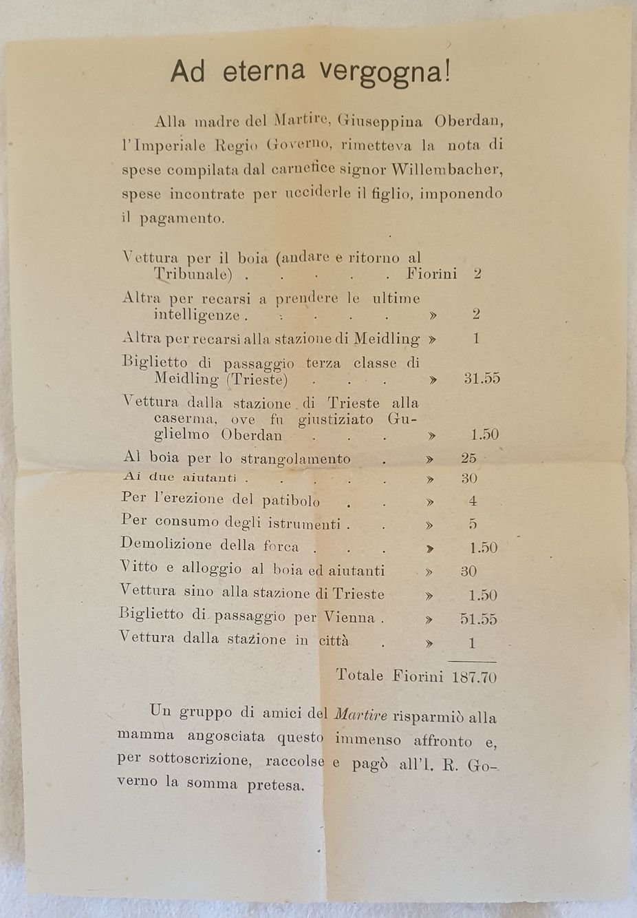 Volantino originale della fine dell'ottocento, la lista delle spese sostenute per l'uccisione del patriota irredentista Guglielmo Oberdan (1858-1882). L'elenco delle spese venne inviata alla madre Giuseppina Oberdan dal boia Willembacher. Questo volantino è stato scritto e diffuso da un gruppo di amici e simpatizzanti del martir In ottime condizioni. Piegature In 8. Dim. cm 24,5x17,5. Original poster of the end of 19th century, the list of expenses held for the murdering of patriot Guglielmo Oberdan (1858-1882). The list of expenses was sent to his mother Giuseppina Oberdan byt he murderer Willembacher. This poster has been written and spread bya group of friends of marty In very good conditions. Foldings In 8. Dim. cm 24,5x17,5. <BR><BR>