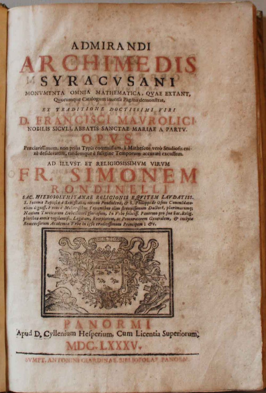 Admirandi Archimedis Syracusani Monumenta omnia mathematica, quae extant, quorumque catalogum inversa pagina demonstrat, ex traditione . D. Francisci Maurolici . opus praeclarissimum, non prius typis commissum, à matheseos verò studiosis desideratum,