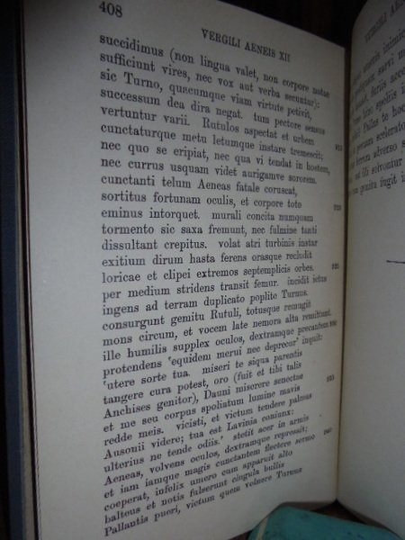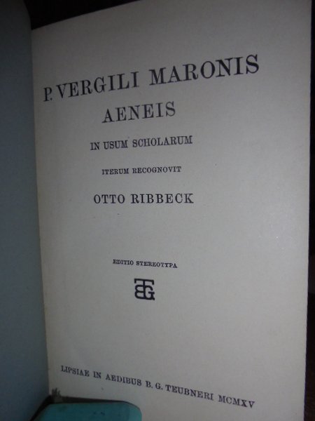 AENEIS in usum scholarum iterum recognovit Otto Ribbeck. Editio stereotypa. P. Vergili Maronis. Lipsiae in aedibus B.G. Teubneri, 1915. In-16°, leg. edit., 309 pp. (da pp. 99 a pp. 409). Completo. Neg. mob. 7