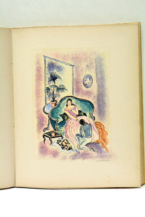 4 feuillets. 86 pages. 3 feuillets. (24,5x19 cm). Broché. Couverture imprimée,rempliée. 12 hors-texte en couleurs. Plats légerement salis. Coins émoussés. Petits accros au dos. Intérieur en bon état. Edition originale de Affaires de coeur, imprimé sur vélin d'Arches, receuil de quatre textes qui sont la rencontre entre un auteur et un illustrateur : "Le coeur et la littérature", par Abel Hermant de l'Académie française avec les trois illustrations pleine page en couleur de Hermine David, puis "Le coeur sentimental" par Abel Bonnard avec les trois illustrations pleine page en couleurs de Jean Berque, puis "Le coeur des bêtes" par Colette, illustré de trois planches en couleurs d'Henri Deluermoz, et enfin de "Le coeur moteur" de Paul Morand, illustré de trois planches en couleurs d'André Dignimont. L'ouvrage a été imprimé sur vélin d'arches en 600 exemplaires, dont celui-ce est le Nº 169, imprimé spéclement pour M. Le Professeur Castaigne.