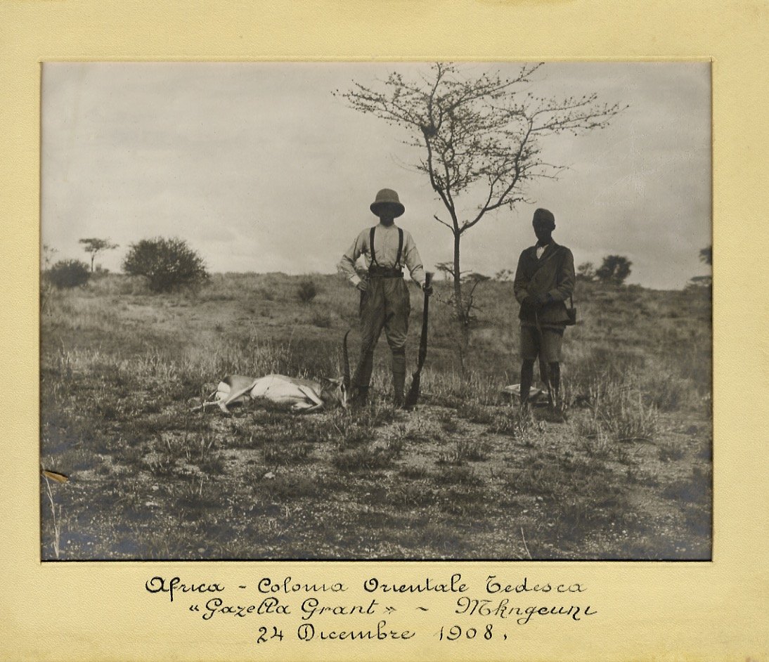 Mkngeuni, [s.n.], 1908, una fotografia originale, mm. 186x252, raffigurante un cacciatore europeo e un suo aiutante; accanto al cacciatore una gazzella di Grant, appena uccisa. La foto è inserita entro un passepartout che reca la data e il luogo dell'evento manoscritti sul margine inferiore. Sul retro della foto manoscritta a matita l'annotazione: Principe di Piemonte. Ottime condizioni.