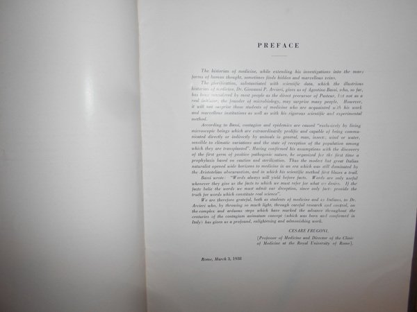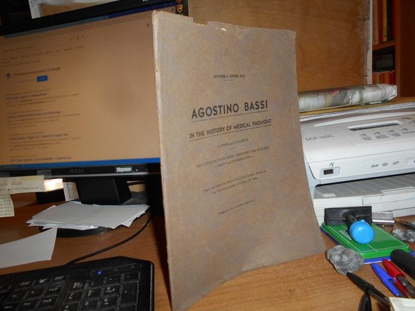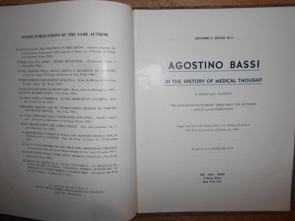 Giovanni P. Arcieri. New York, the Vigo Press, 1938. AGOSTINO BASSI in the History of Medical Thought. The contagium vivum theory throughout the centuries aspects and considerations. In-8° grande, cartoncino edit. 30 pp. con alcuni ritratti nel testo. Opuscolo ben conservato. Uff. A - I - 1 - 2