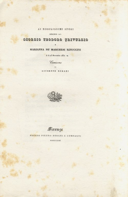 Ai nobilissimi sposi marchese Giorgio Teodoro Trivulzio e Marianna de' Marchesi Rinuccini, il dì 23 Novembre 1831. Canzone.