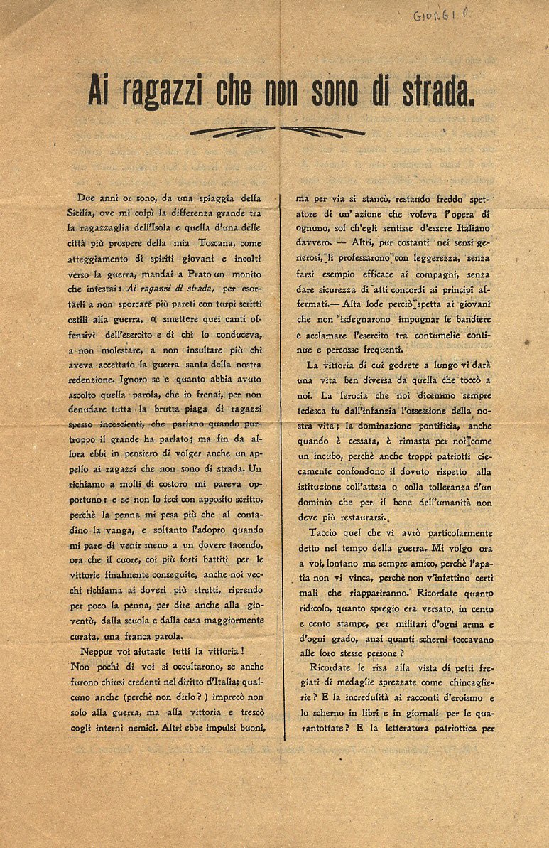 Prato, Stabilimento Lito-Tipografico Pratese M. Martini, [c. 1918], foglio volante impresso su due facciate, mm. 320x210. Testo teso a rivalutare la sforzo bellico e la Vittoria, stimolando lo spirito patriottico delle nuove generazioni. Firmato in calce: P. Giorgi. Roma 14 novembre 1918.
