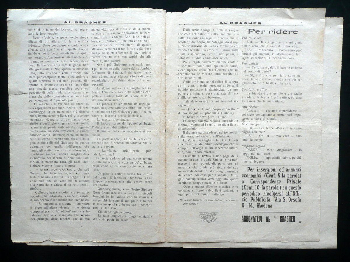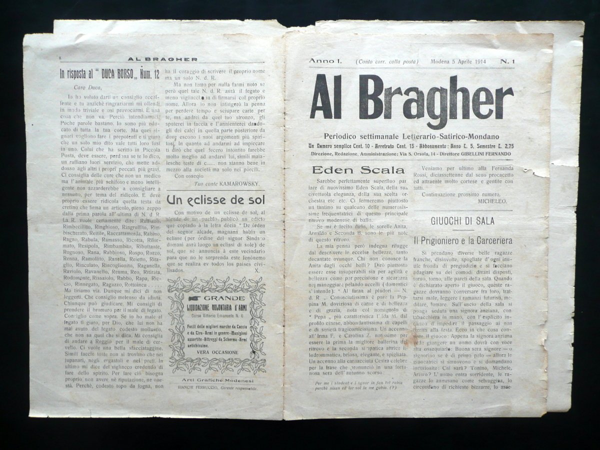 Settimanale, Al Bragher" Periodico settimanale Letterario - Satirico - Mondano Anno I - Numero 1 Modena, 5 Aprile 1914 Arti Grafiche Modenesi, Modena 1914, cm 32x22, pp. 8; esemplare a fogli sciolti. Numero completo. Condizioni di conservazione Esemplare in condizioni pi√π che discrete con tracce d'uso, leggere tracce di pieghe di conservazione, qualche piccolo lieve alone e brunitura; margini con alcuni strappetti anche di qualche cm (vedi foto); pagina 5 con poche minime abrasioni e una minuscola mancanza che non compromette la lettura del testo. Raro numero 1. Numero completo. SC03.D10654 N "