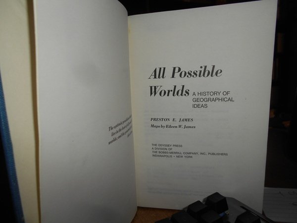 PRESTON E. JAMES. Indianapolis, The Odyssey Press, 1972. Al Possible Worlds. A History of Geographical ideas. In-8°, tela bleu con titolo in oro entro tassello al dorso. xiii, 622 pp. con alcune cartine in bianco e nero nel testo. Come nuovo. Uff. B - III - 7