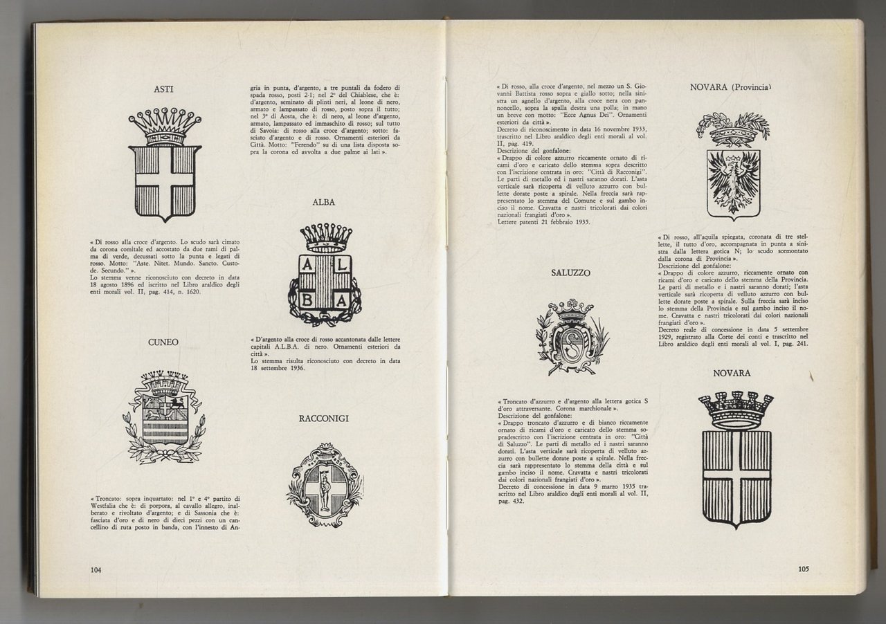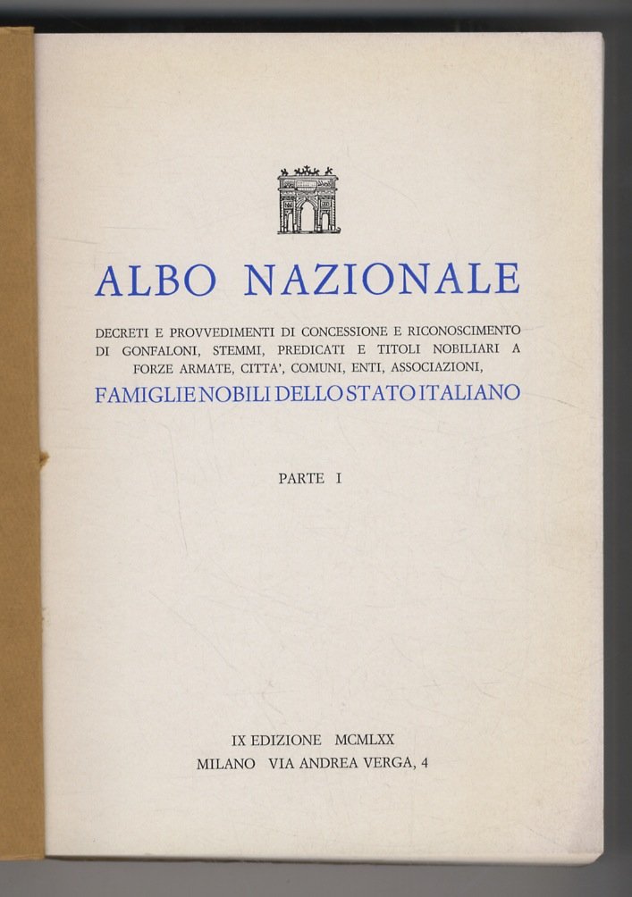 Albo Nazionale Decreti e provvedimenti di concessione e riconoscimento di gonfaloni, stemmi, predicati e titoli nobiliari a forze armate, città, comuni, enti, associazioni, famiglie nobili dello Stato Italiano. Parte I - Parte II.