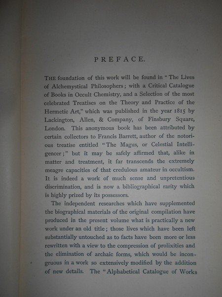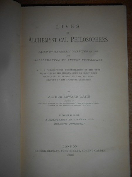 (Alchimia) Arthur Edward Waite. London, George Redway, 1888. Lives of Alchemystical Philosophers. Based on materials collected in 1815 and supplemented by recent researches. In-8° piccolo, piena pelle edit. con titolo in oro al dorso. 315, (4) pp. Ottimo esemplare. Chiedere se disponibile. VENDIBILE SOLO IN ITALIA. Uff. C - II - 3